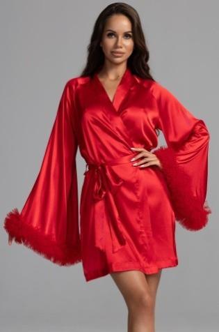 Короткий халат Mia-Amore выполнен из мягкого искусственного шёлка. Рукава запашного халата по низу украшены пышной многослойной сетчатой рюшей. В боковых швах халата карманы. Халат запахивается с помощью широкого пояса.