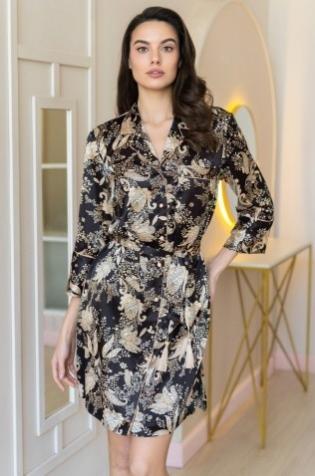 Рубашка Mia-Amore до колен с центральной застежкой на пуговицы и с рукавами длиной 7-8 выполнена из принтованного смесового шёлка. Воротник и широкие манжеты декорированы контрастным кантом. На груди рубашки накладной кармашек. Рубашка комплектуется поясом с декоративными кисточками, в боковых швах есть карманы.