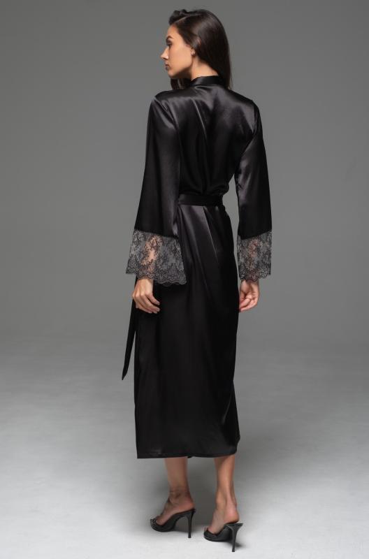 Длинный запашной халат Mia-Amore выполнен из однотонного смесового шёлка. Широкие рукава халата по низу украшены широким кружевом. Спереди верх халата украшен вставками из кружева. В боковых швах есть карманы. Халат запахивается с помощью широкого съемного пояса.
