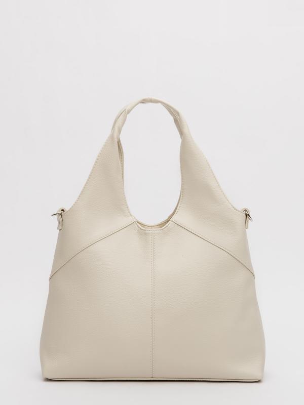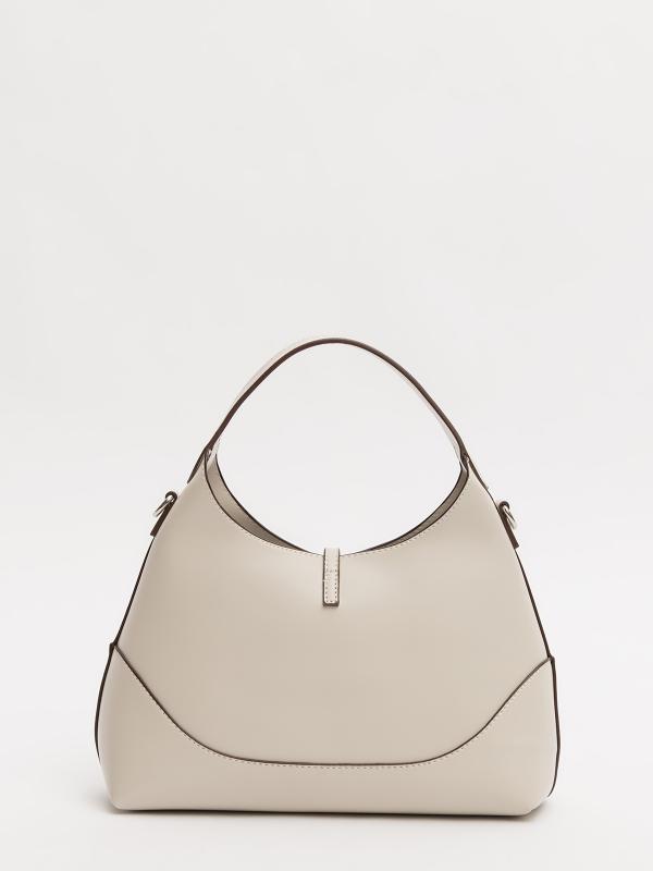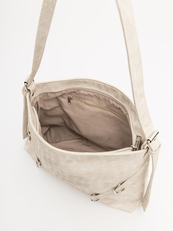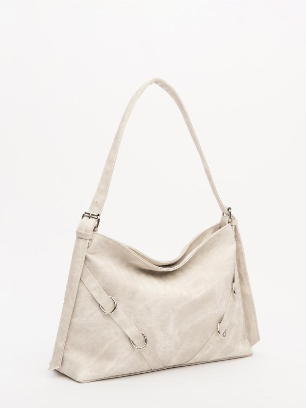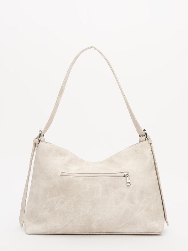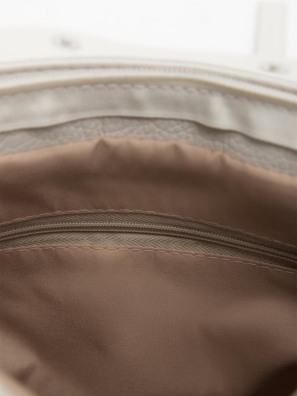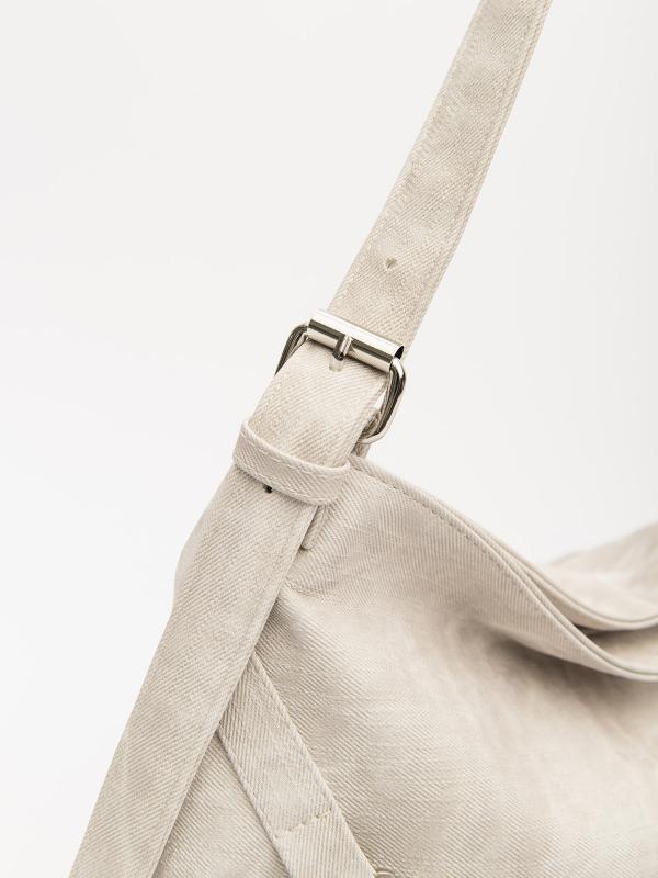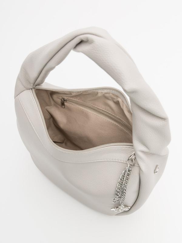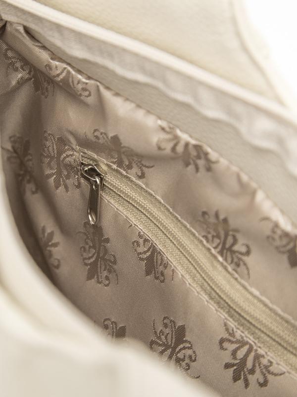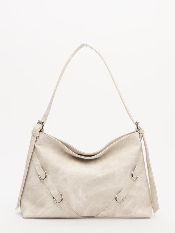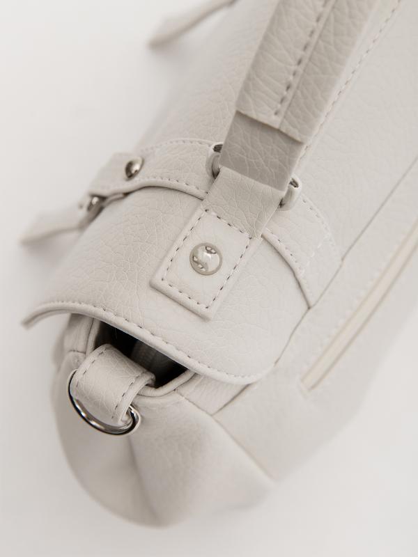Женственный акцент с трендовыми деталями. Элегантная форма хобо с декоративными ремнями и металлической фурнитурой представлена в нежном молочном оттенке. Сочетание винилискожи с отделкой под ден
