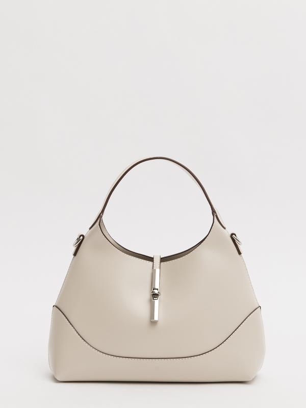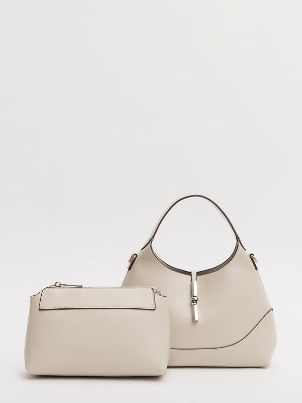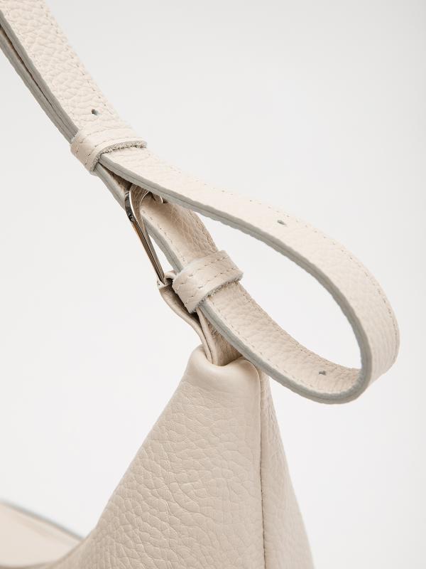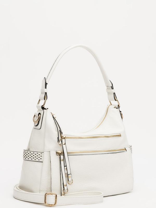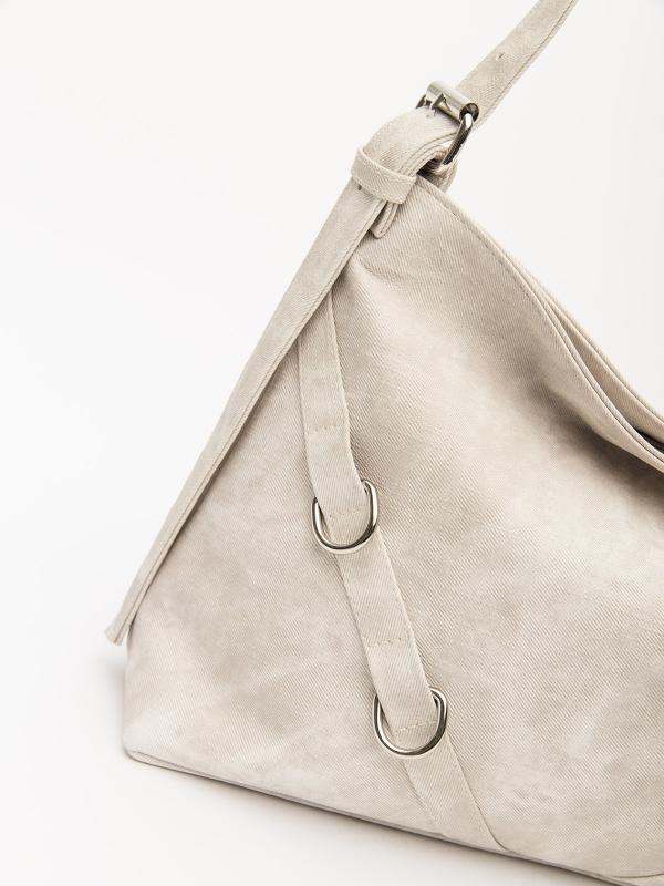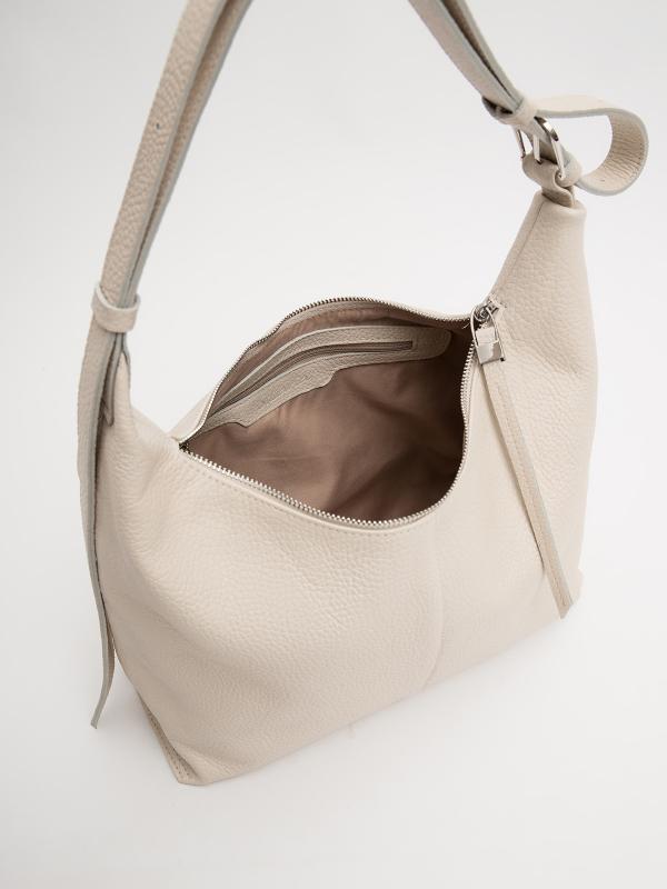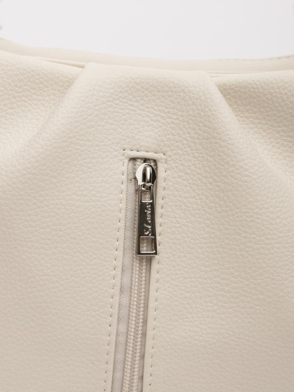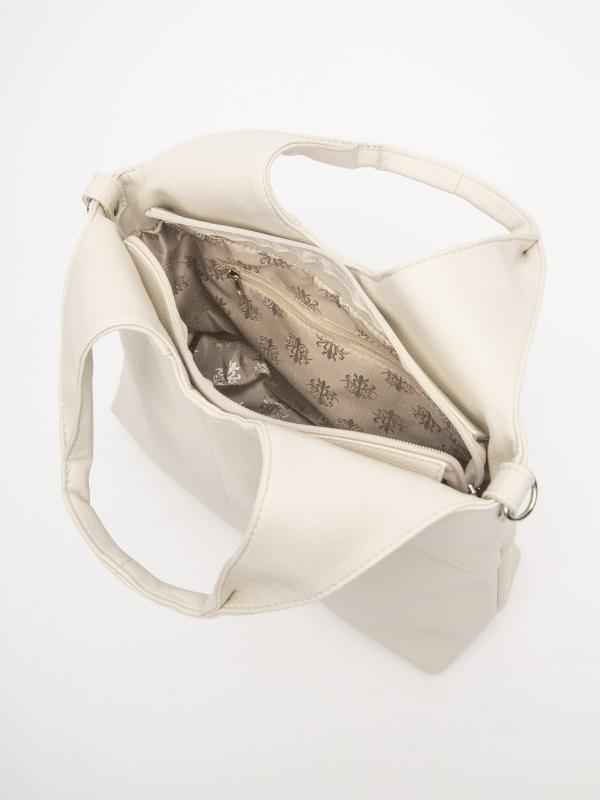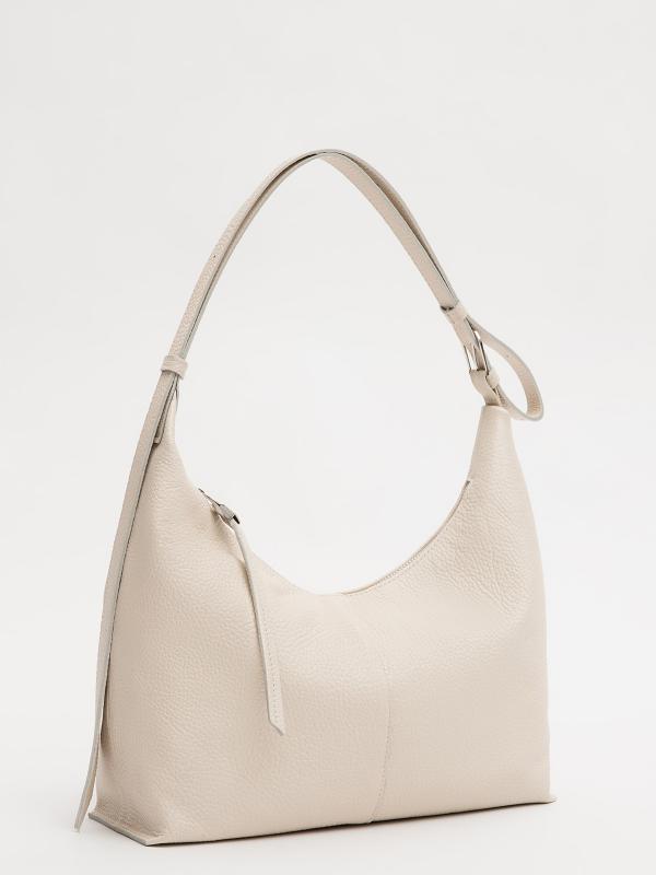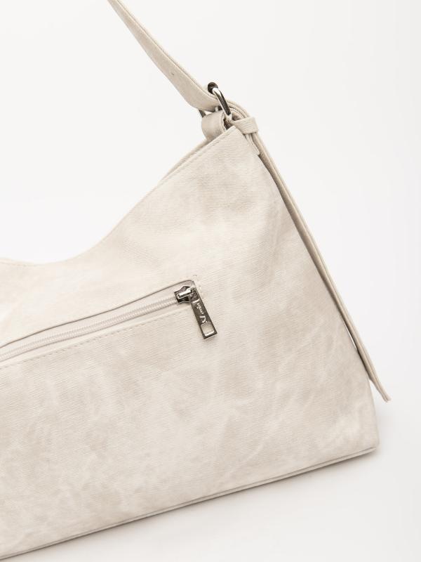 Женственный акцент с трендовыми деталями. Элегантная форма хобо с декоративными ремнями и металлической фурнитурой представлена в нежном молочном оттенке. Сочетание винилискожи с отделкой под ден