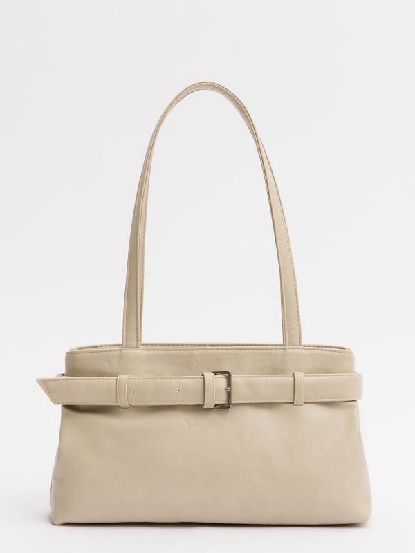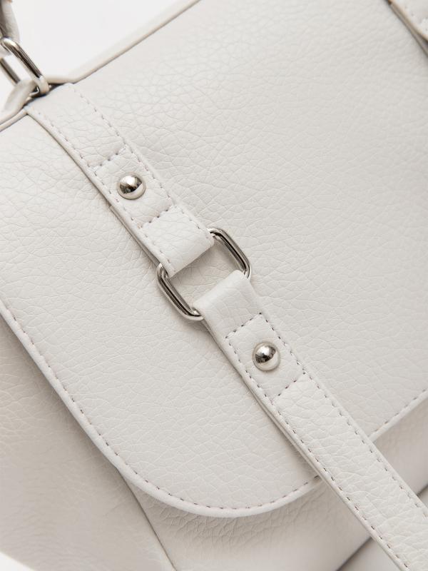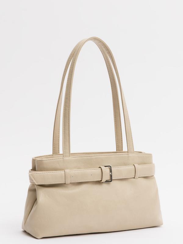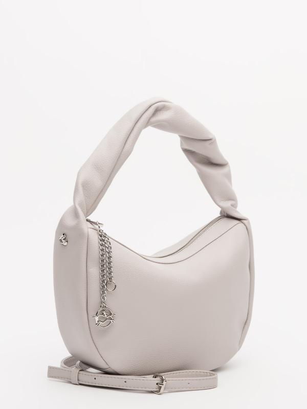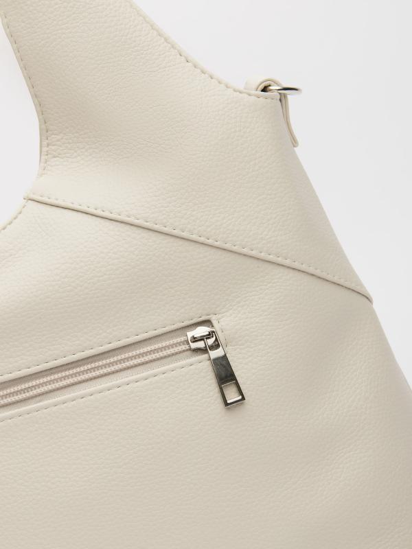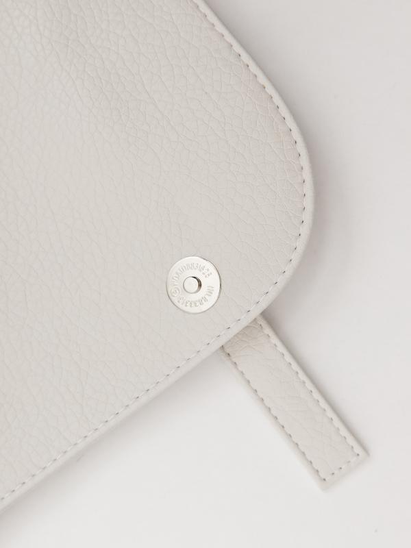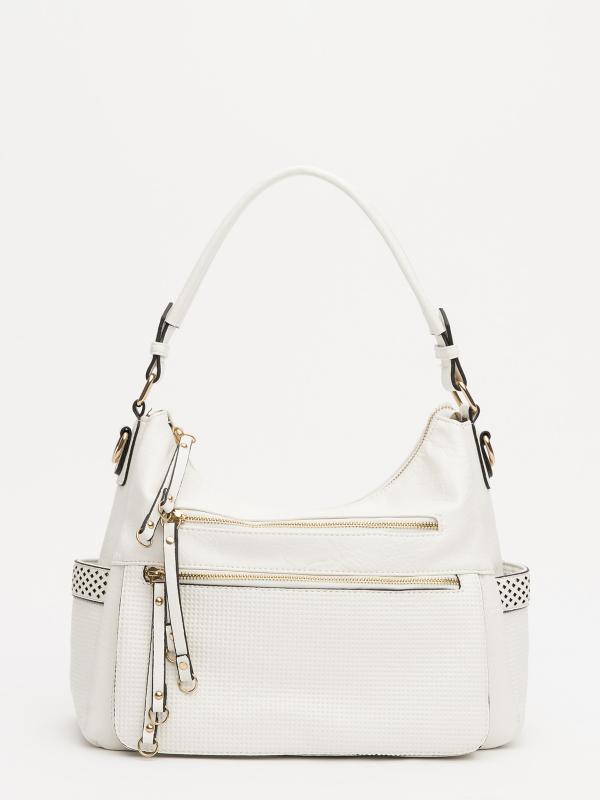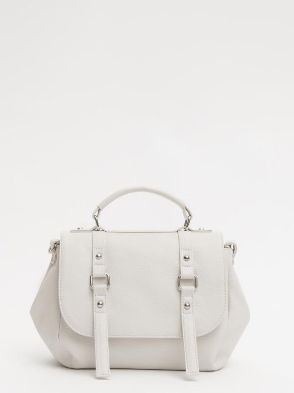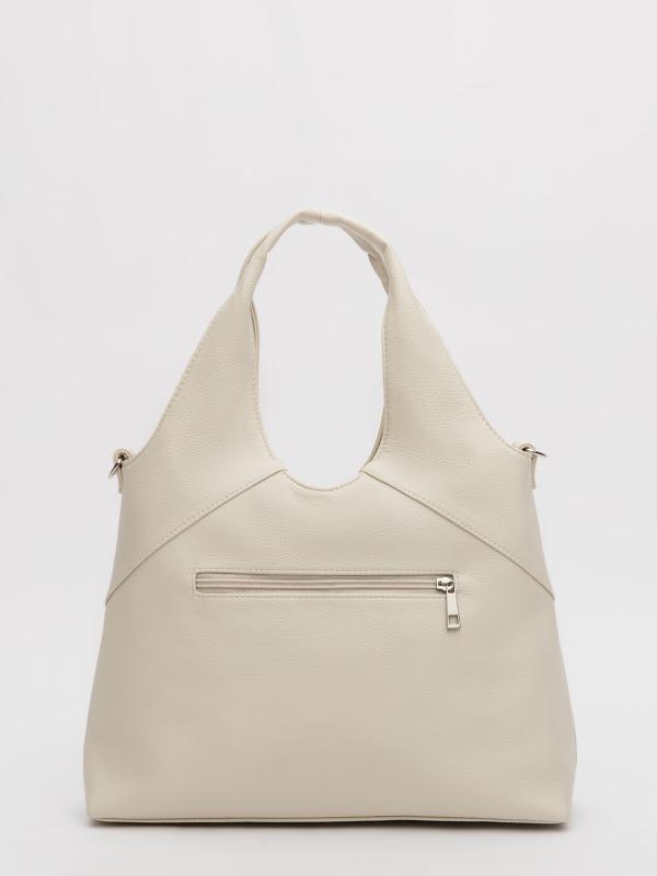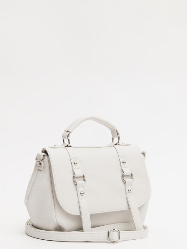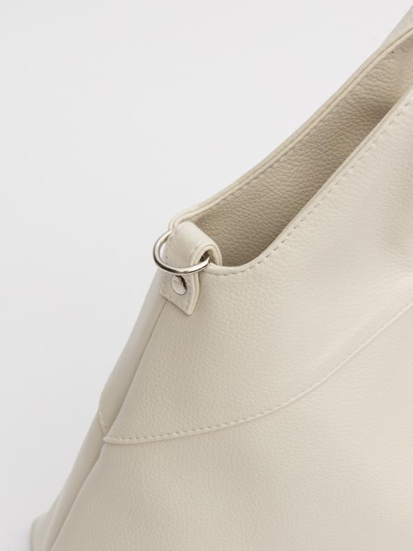 Женственный акцент с трендовыми деталями. Элегантная форма хобо с декоративными ремнями и металлической фурнитурой представлена в нежном молочном оттенке. Сочетание винилискожи с отделкой под ден