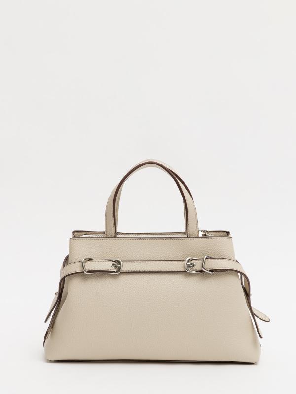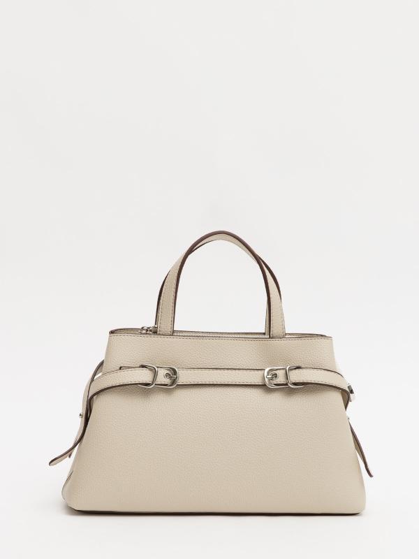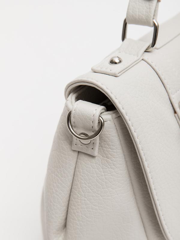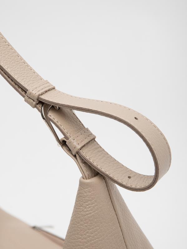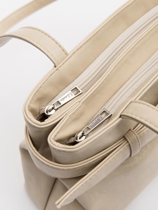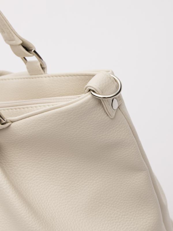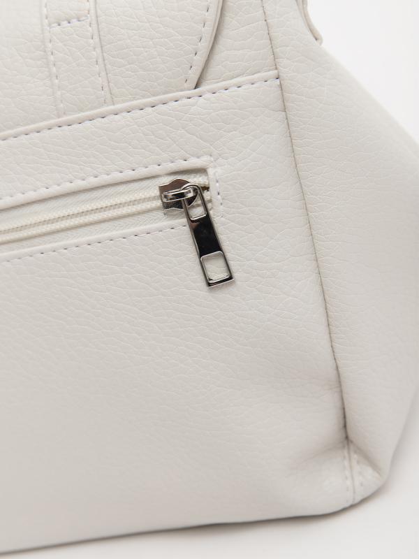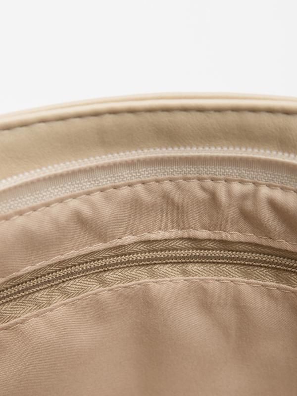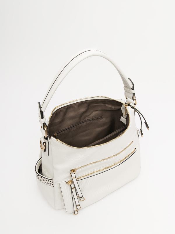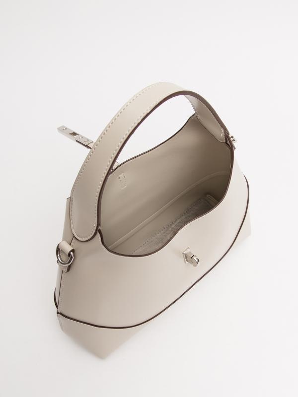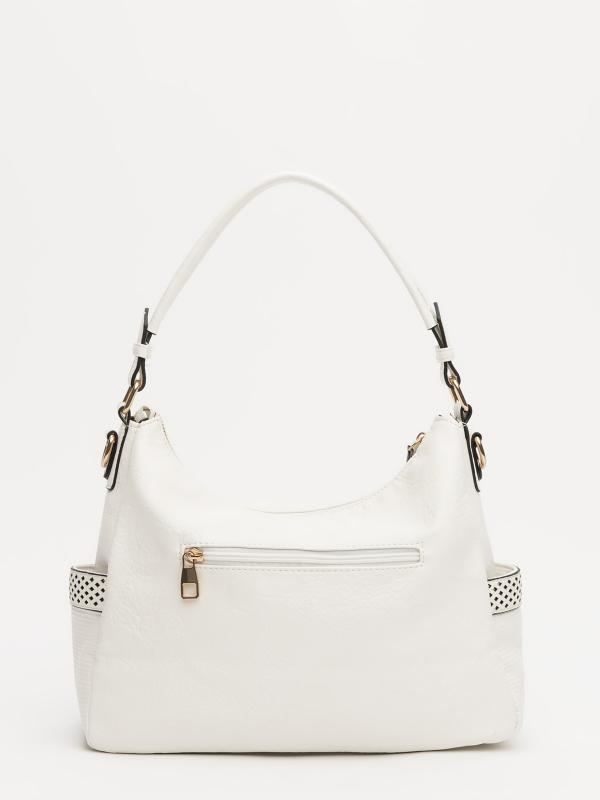 Женственный акцент с трендовыми деталями. Элегантная форма хобо с декоративными ремнями и металлической фурнитурой представлена в нежном молочном оттенке. Сочетание винилискожи с отделкой под ден