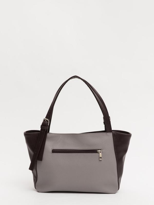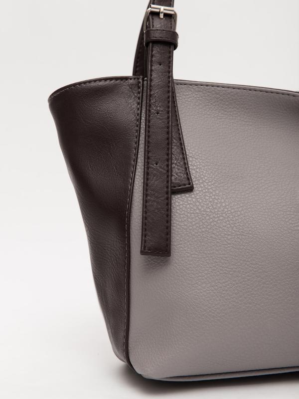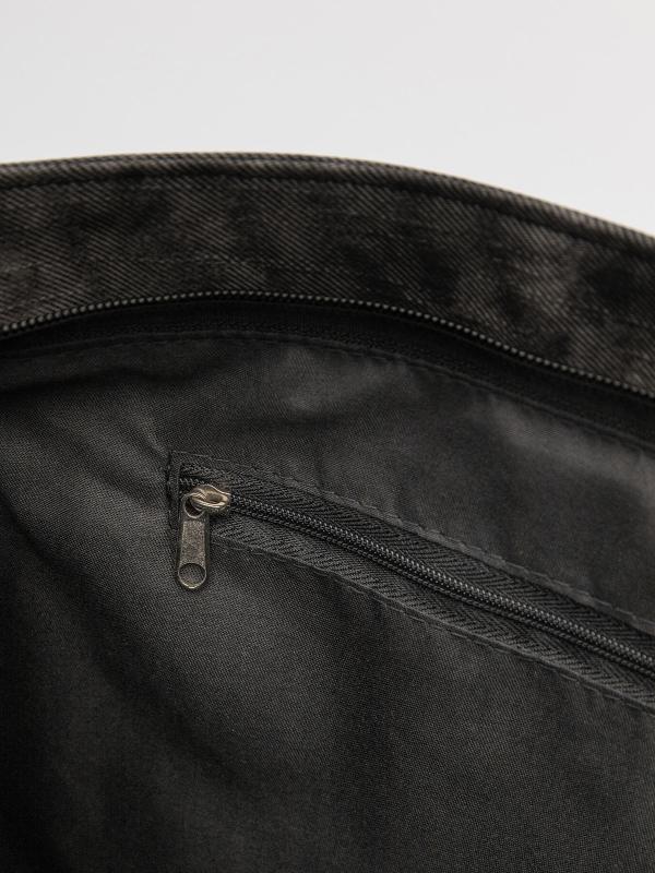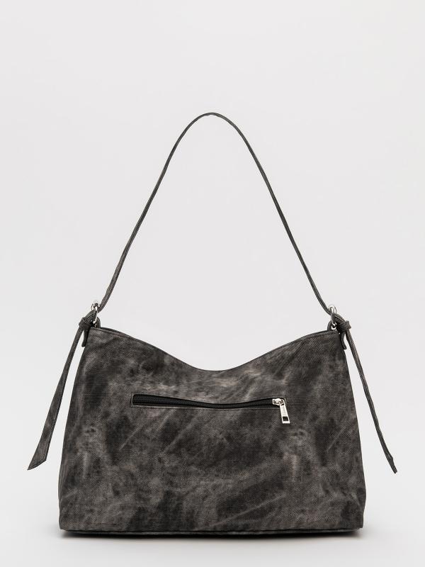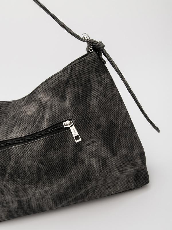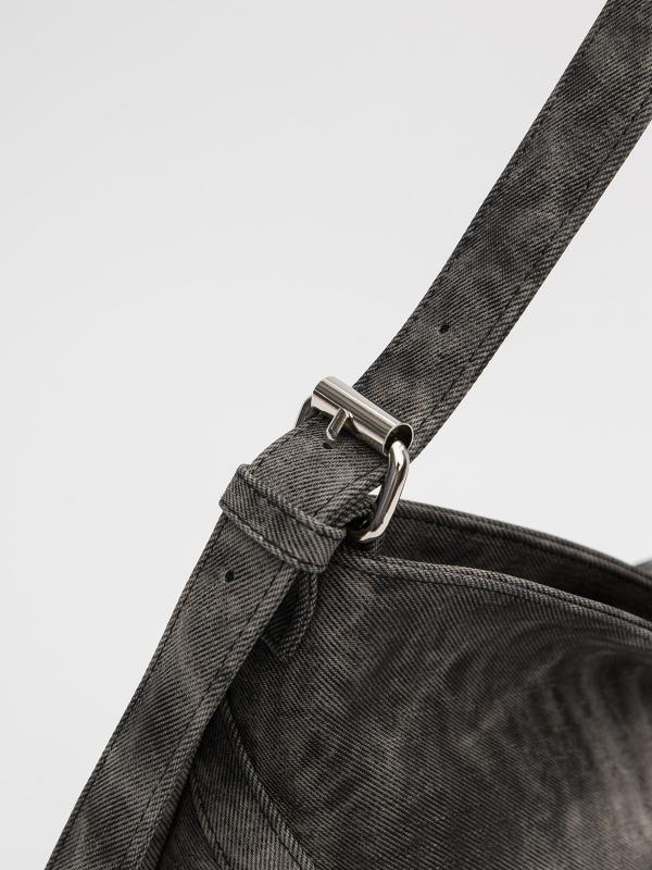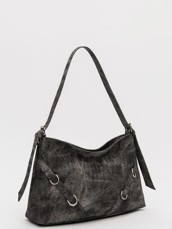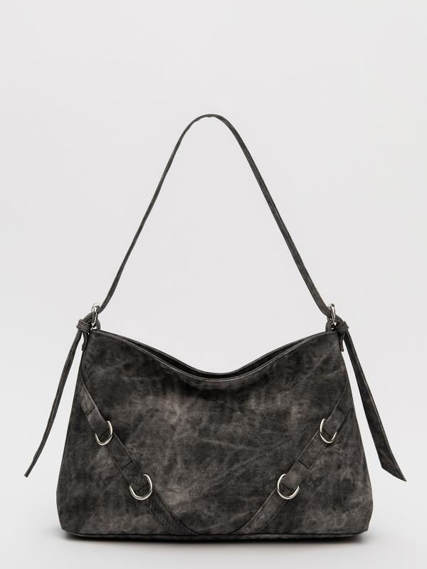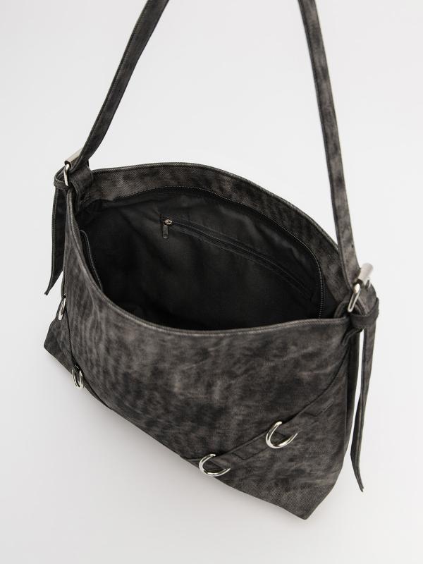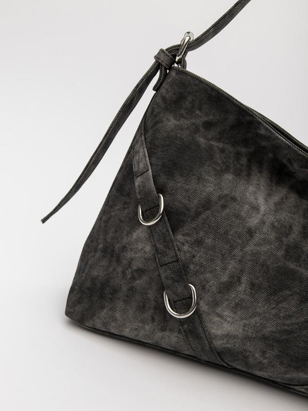 Женственный акцент с трендовыми деталями. Элегантная форма хобо с декоративными ремнями и металлической фурнитурой представлена в тёмно-сером оттенке. Сочетание винилискожи с отделкой под деним и эффектом тай-дай
