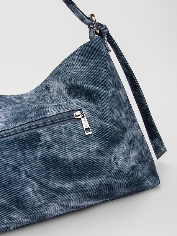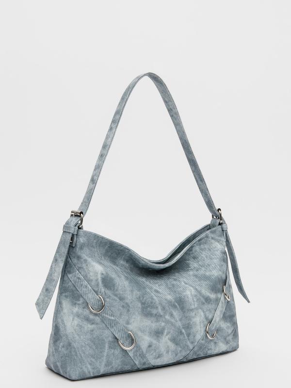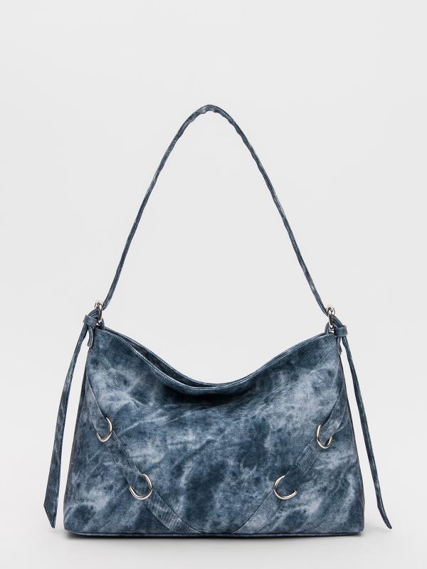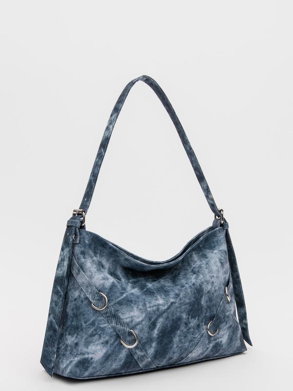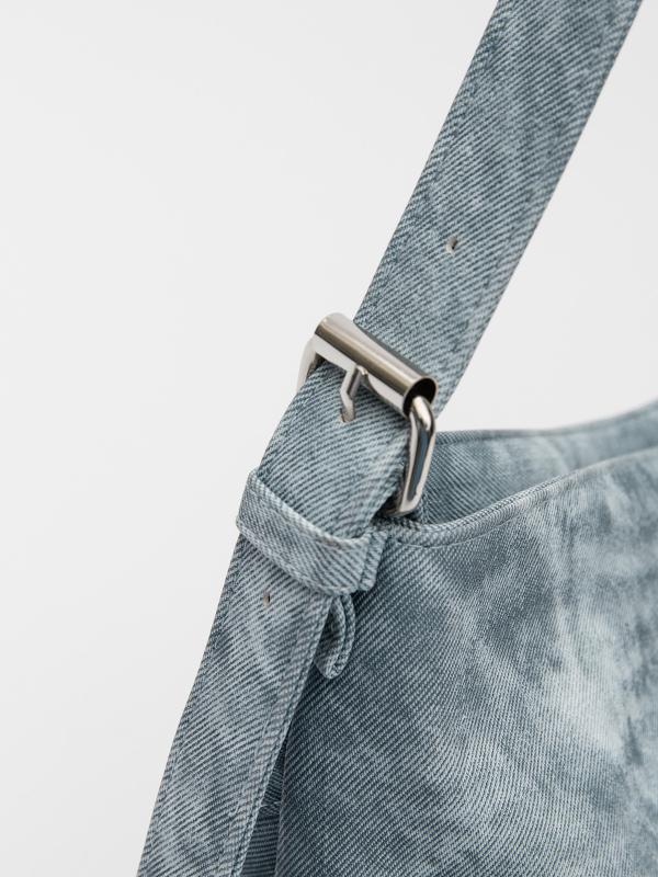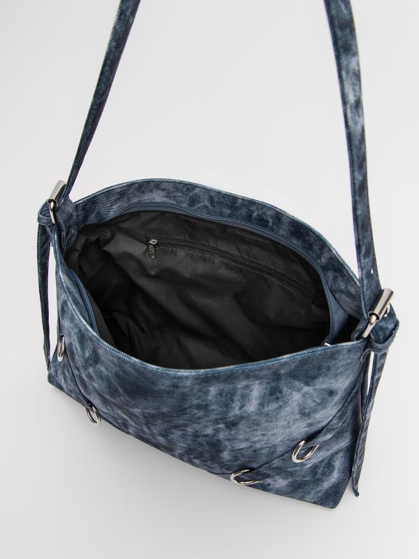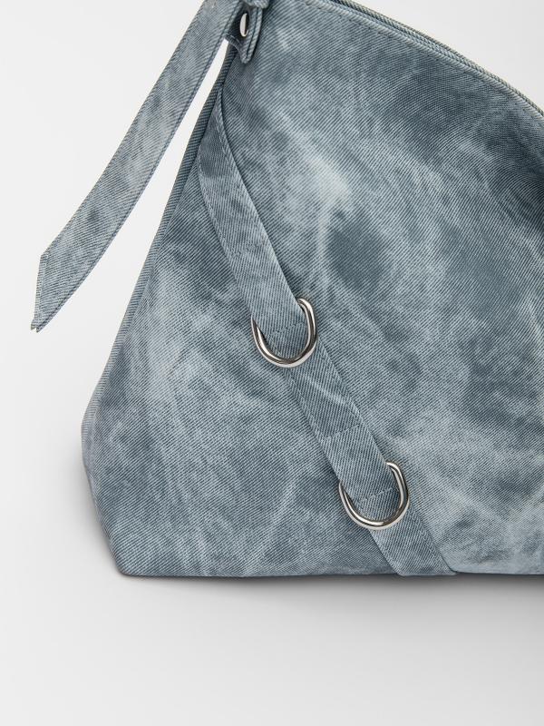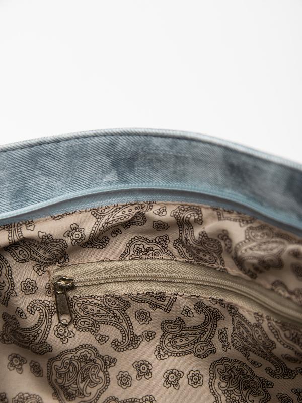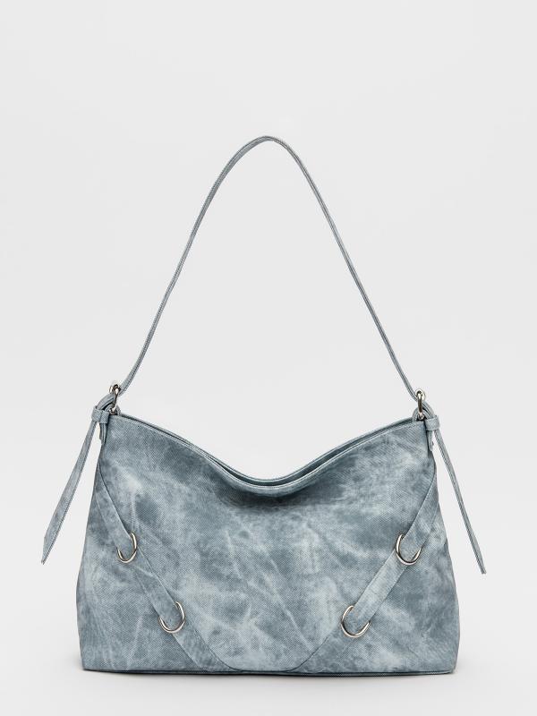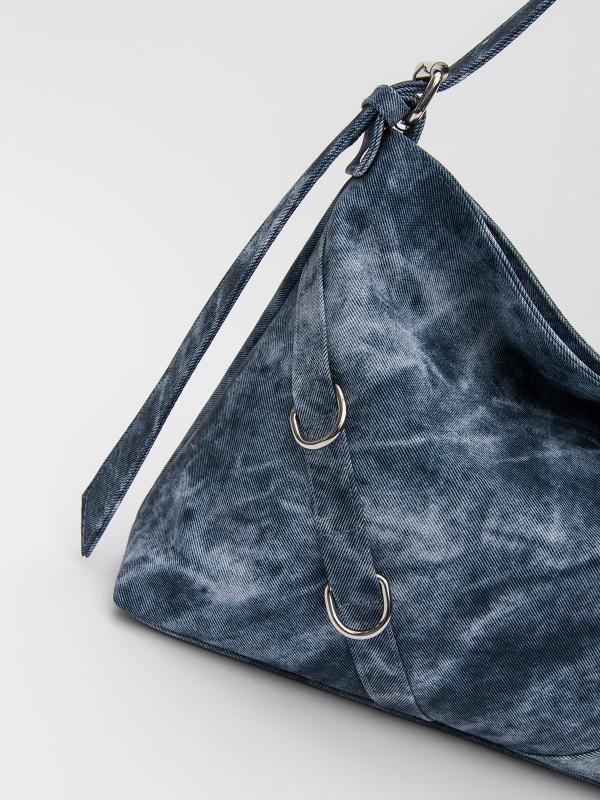 Женственный акцент с трендовыми деталями. Элегантная форма хобо с декоративными ремнями и металлической фурнитурой представлена в голубом оттенке. Сочетание винилискожи с отделкой под деним и эффектом тай-дай