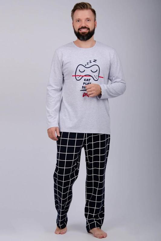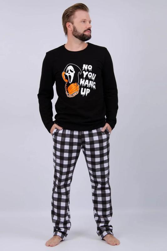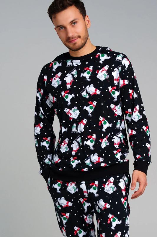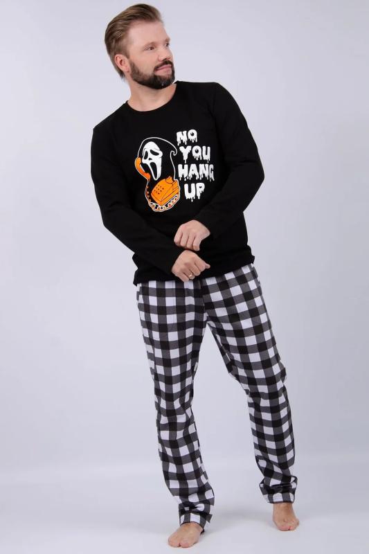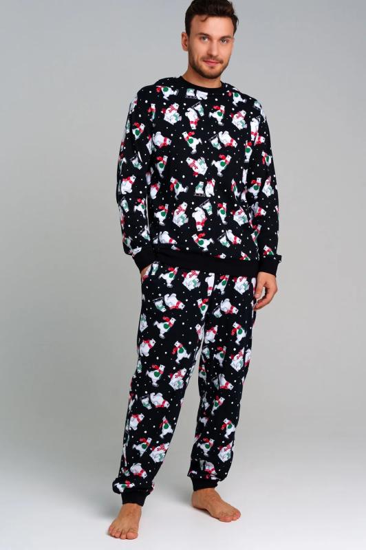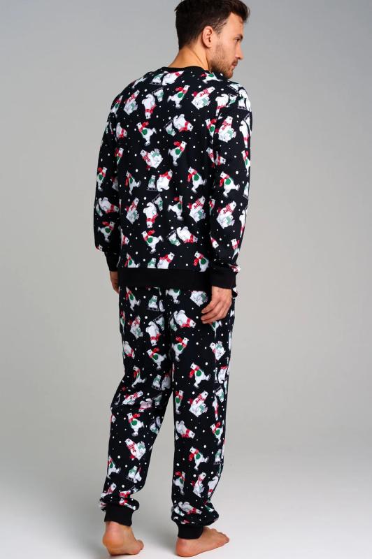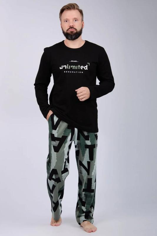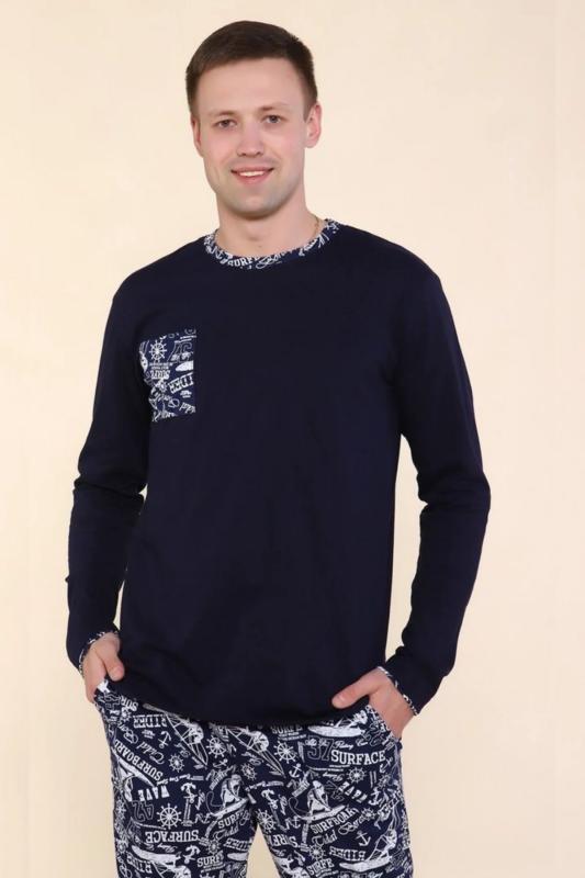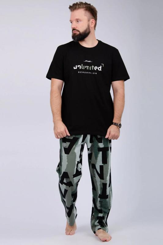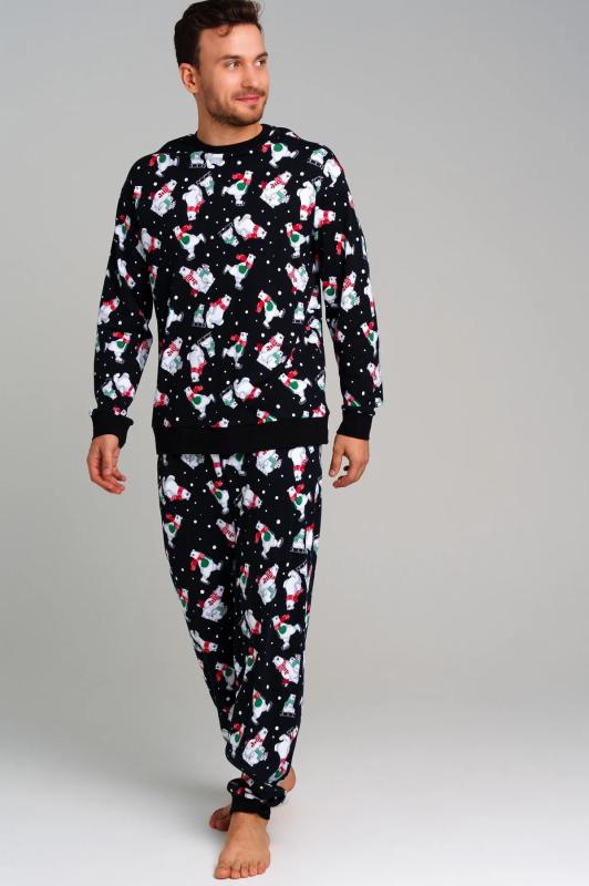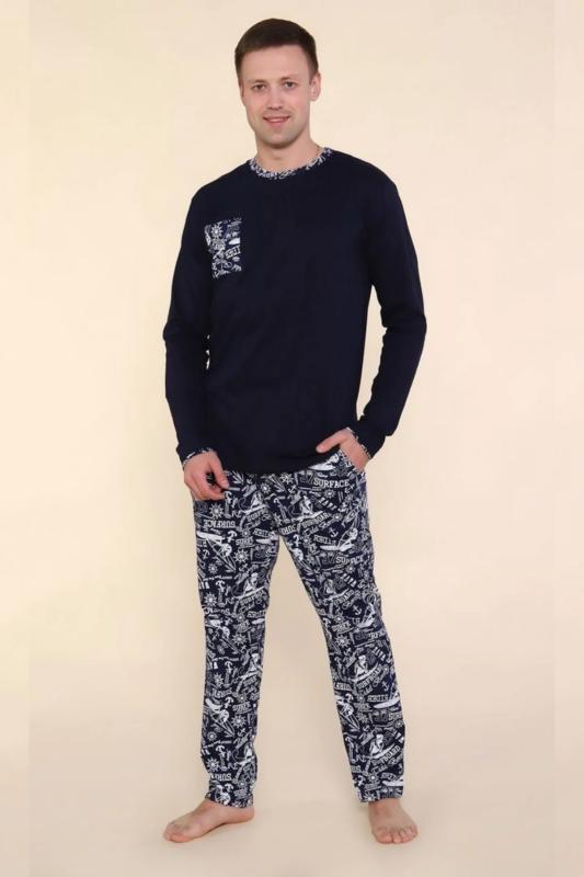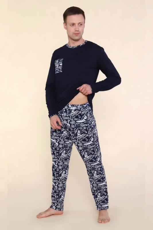Пижама мужская свободного силуэта состоит из кофты и брюк. На полочке принт. Брюки на манжете. В боковых швах карманы.