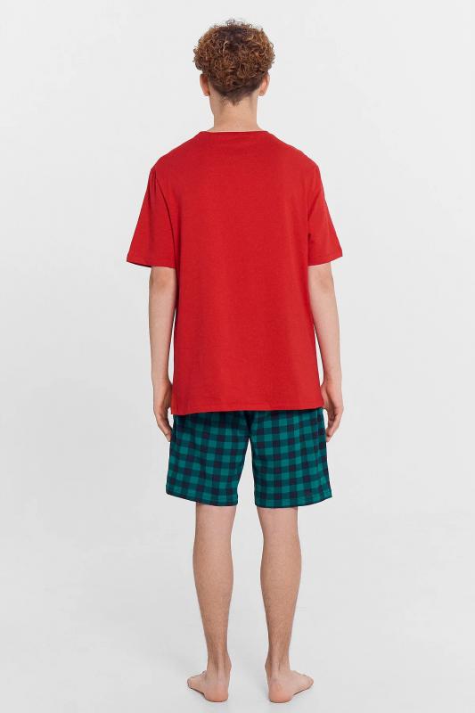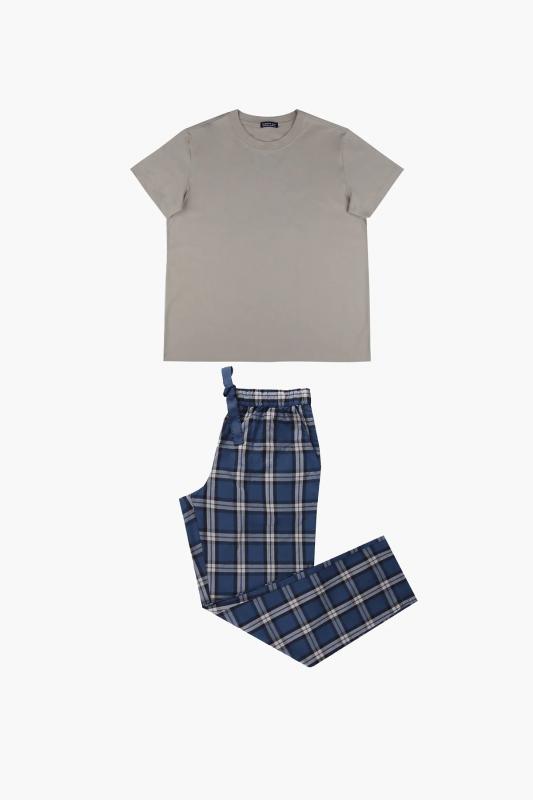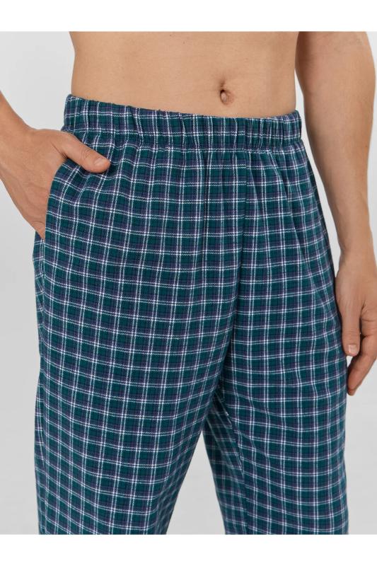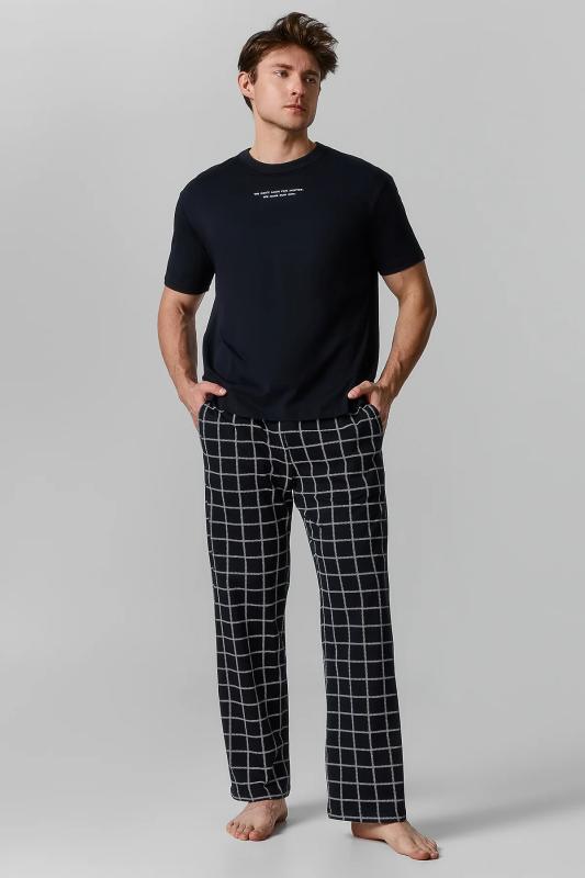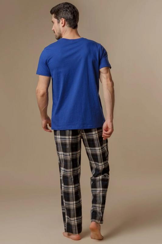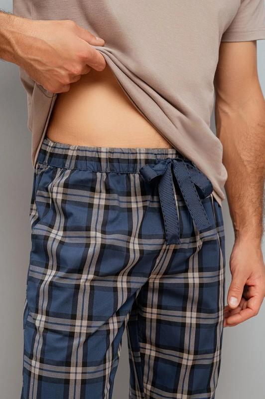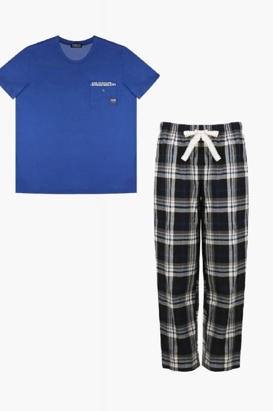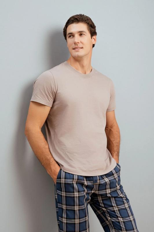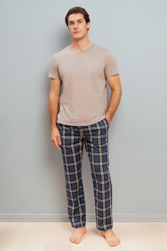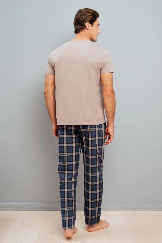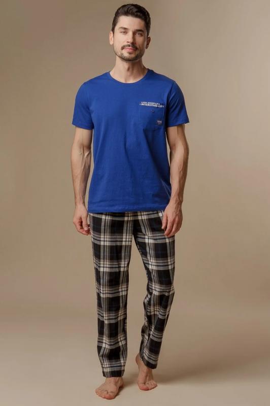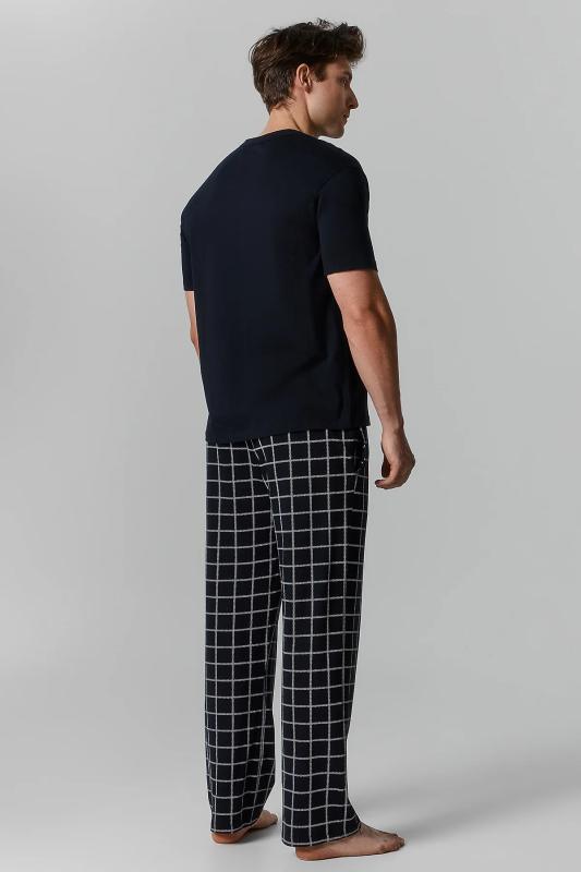 Мужская пижама 4047PBC бренда Indefini, изготовленная из хлопка, состоит из футболки и брюк. Футболка свободного кроя с короткими рукавами и круглым вырезом. Брюки прямого кроя с мягкой эластичной резинкой и регулирующим поясом обеспечивают оптимальную посадку. Брюки украшены клетчатым принтом.