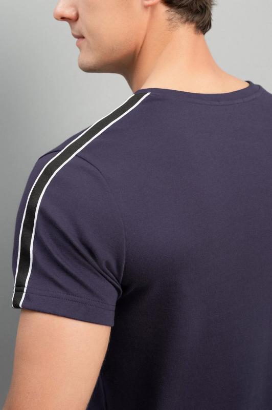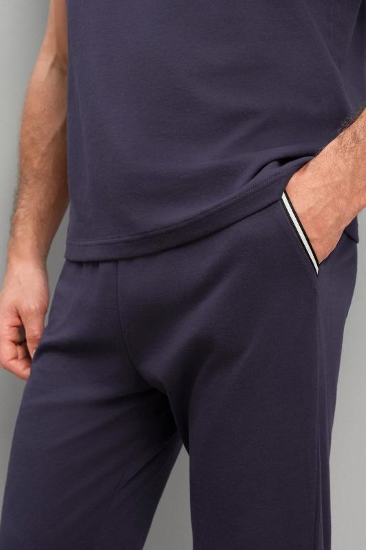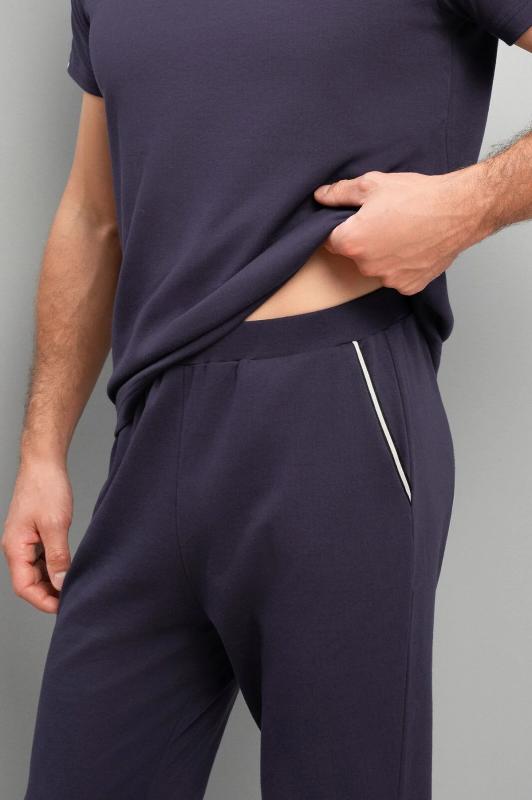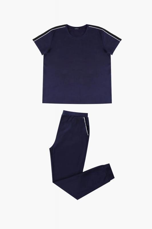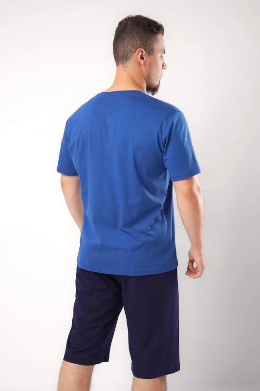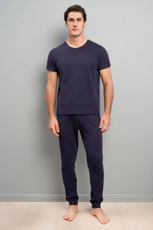 Мужская пижама синего цвета 4040PBC бренда Indefini создана из мягкого хлопкового трикотажа. В комплект входят прямая футболка свободного кроя с декоративными лентами на плечах и прямые брюки с карманами по бокам. Брюки дополнены мягкой эластичной резинкой на манжетах и на талии, обеспечивающая оптимальную посадку.