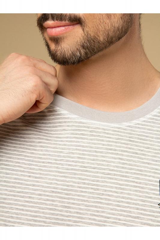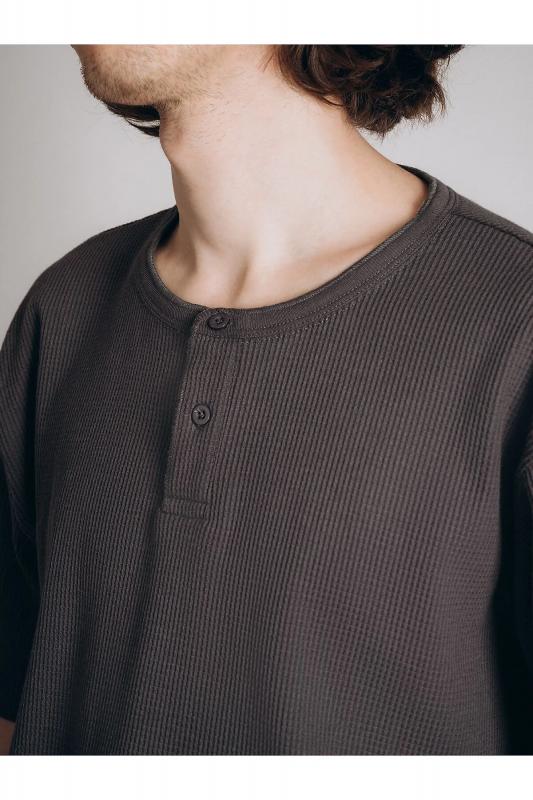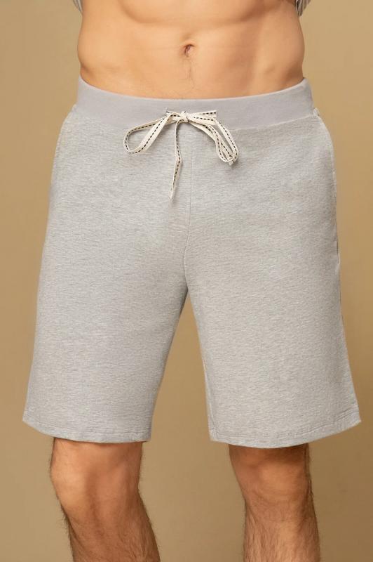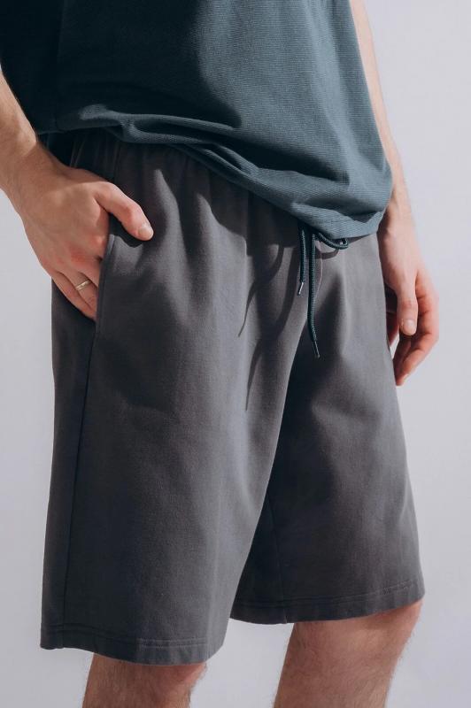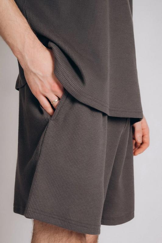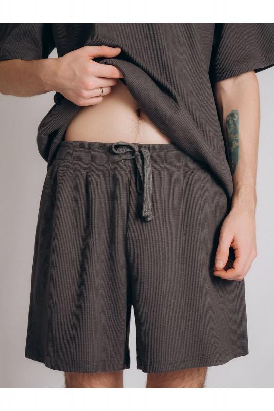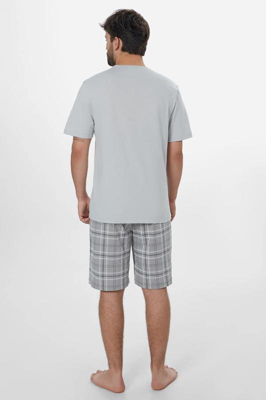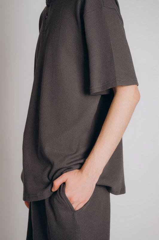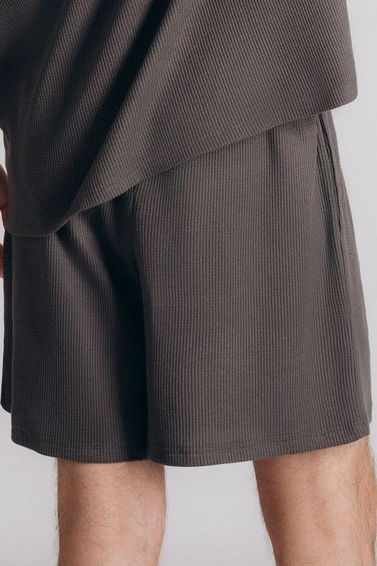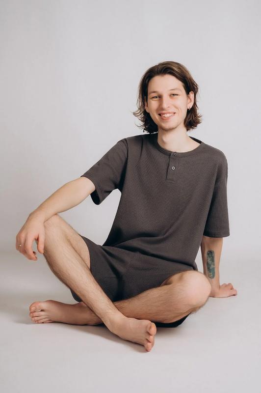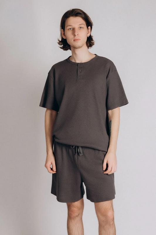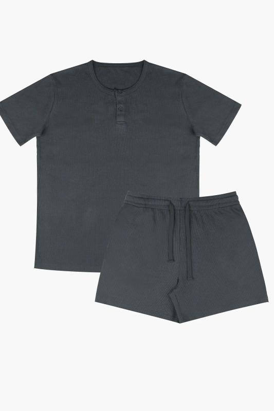 Мужская пижама 4044PBZ бренда Indefini, изготовленная из сочетания хлопка и полиэстера, выполнена в сером цвете с текстурой в рубчик. Пижама включает футболку и шорты. Футболка свободного кроя с короткими рукавами и круглым вырезом дополнена двумя пуговицами на верхней части. Шорты на широкой эластичной резинке с регулирующим шнурком обеспечивают комфортную посадку и свободу движений.