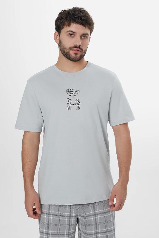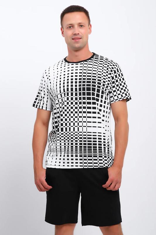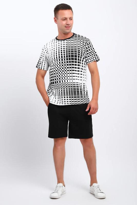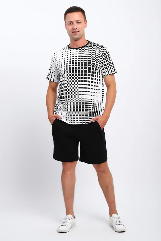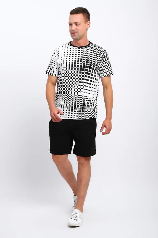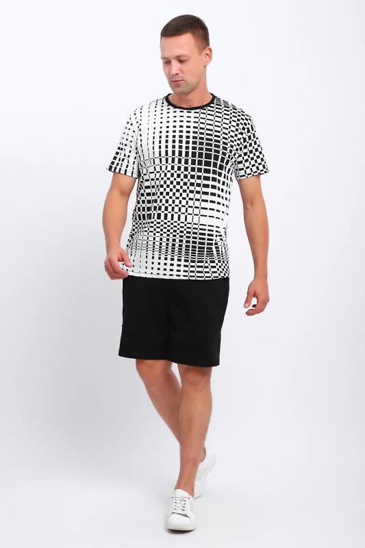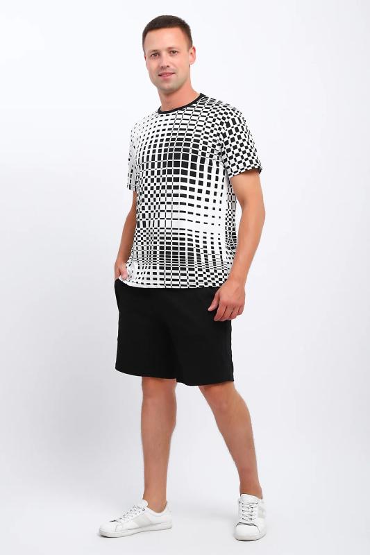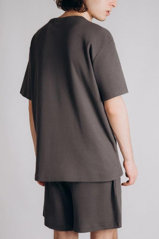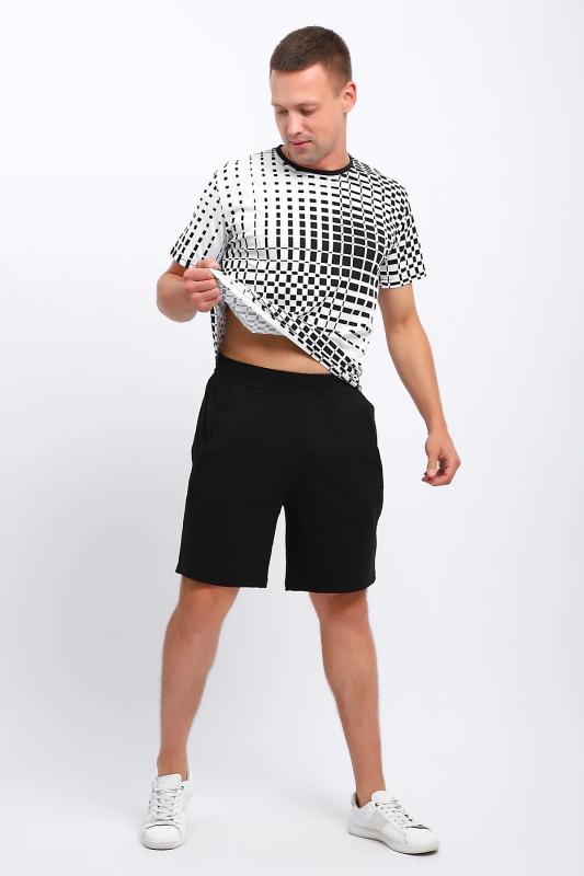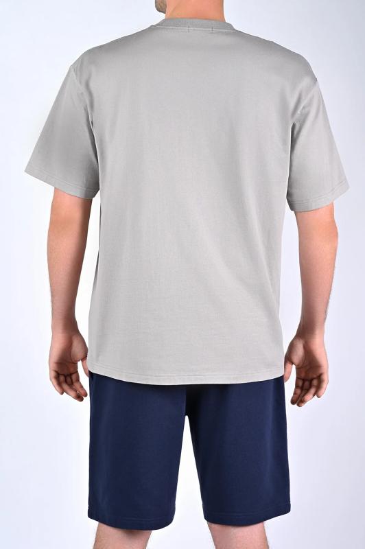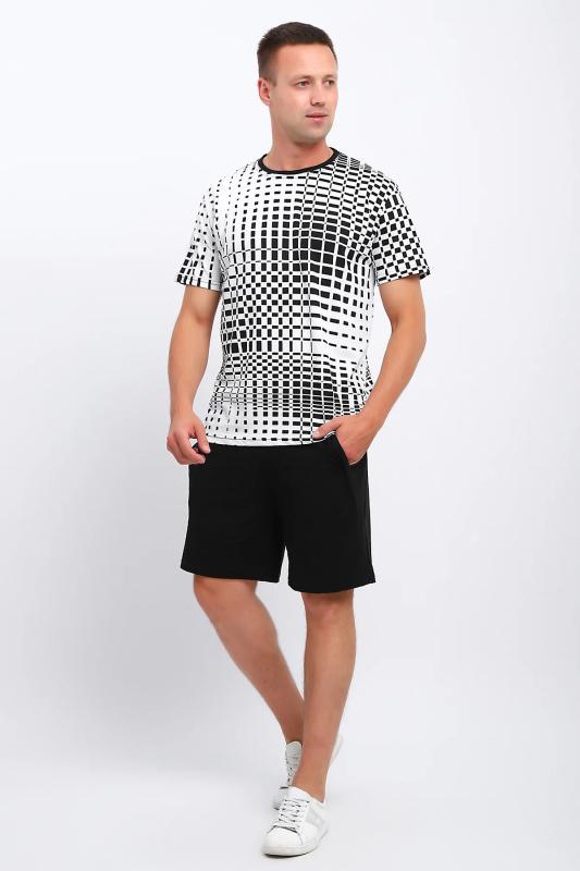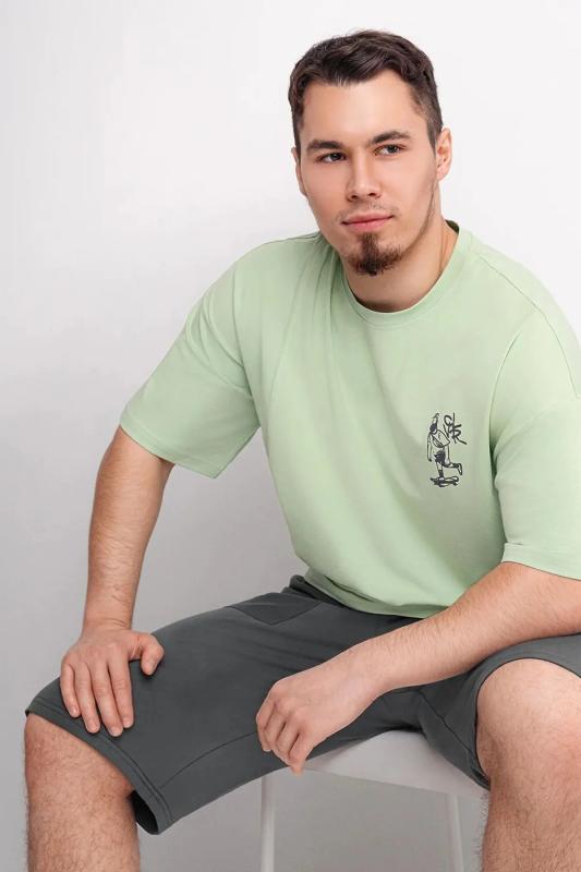 Набор мужской для дома состоящий из футболки и шорт. Футболка из однотонной кулирной глади с круглым вырезом горловины, декоративным резом, коротким рукавом и стильным принтом. Шорты из футера на эластичном поясе с функциональными карманами и шнуром.