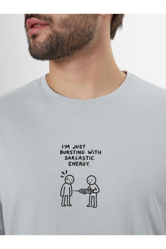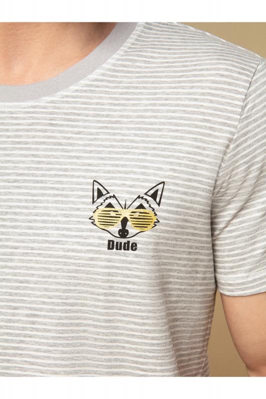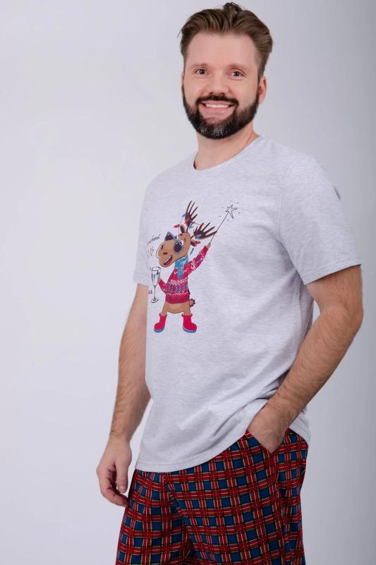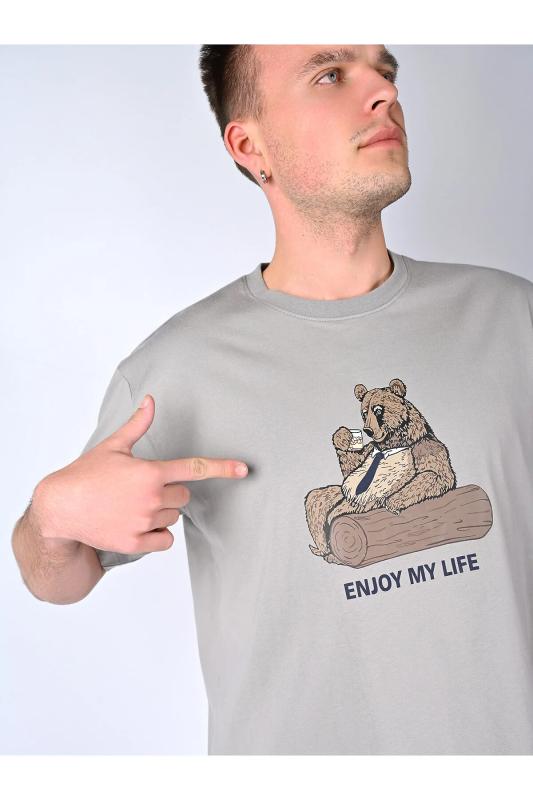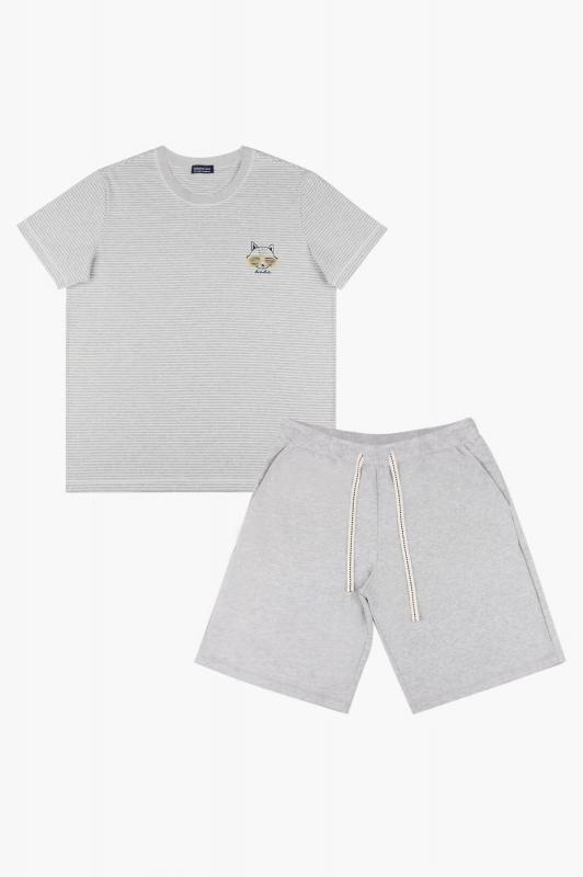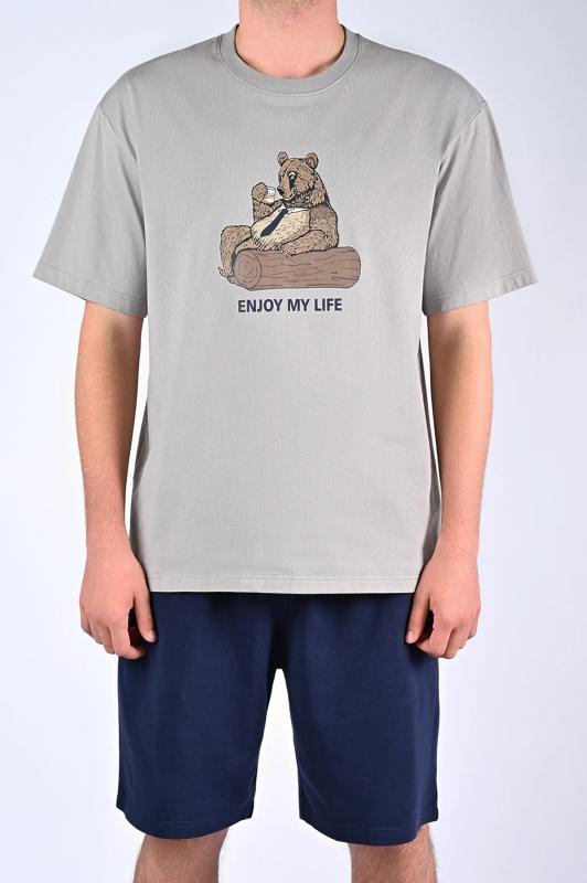 Мужская пижама торговой марки Indefini. Комплект состоит из светло-серой футболки с оригинальным принтом медведя и надписью "