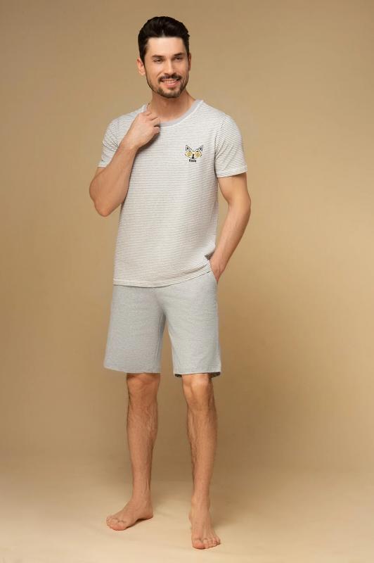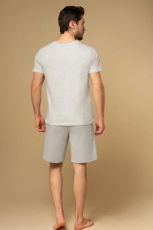 Мужская пижама из хлопкового материала хорошо пропускает воздух и впитывает влагу. Изделие включает в себя футболку в полоску с короткими рукавами, обеспечивающая свободу движений и комфортную посадку. В комплекте также идут шорты в полоску.