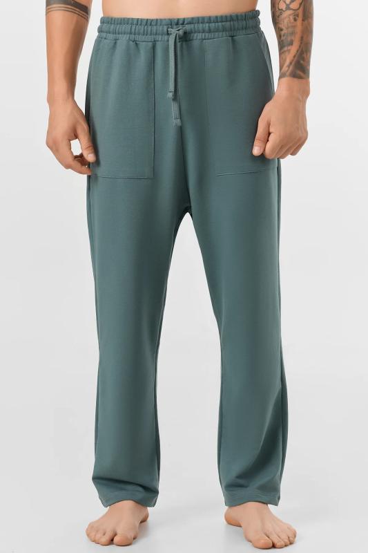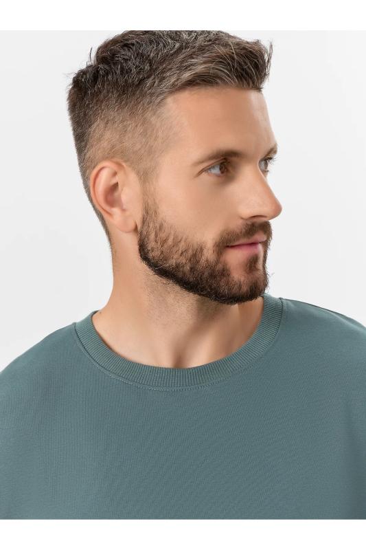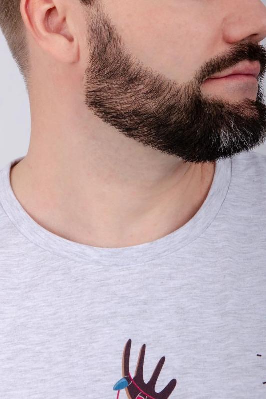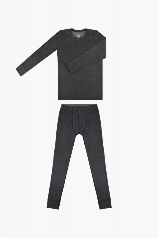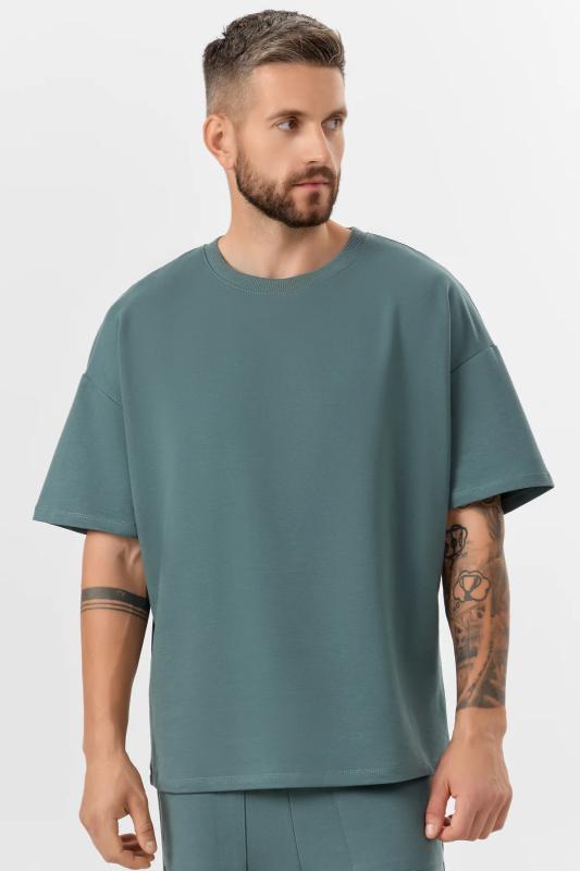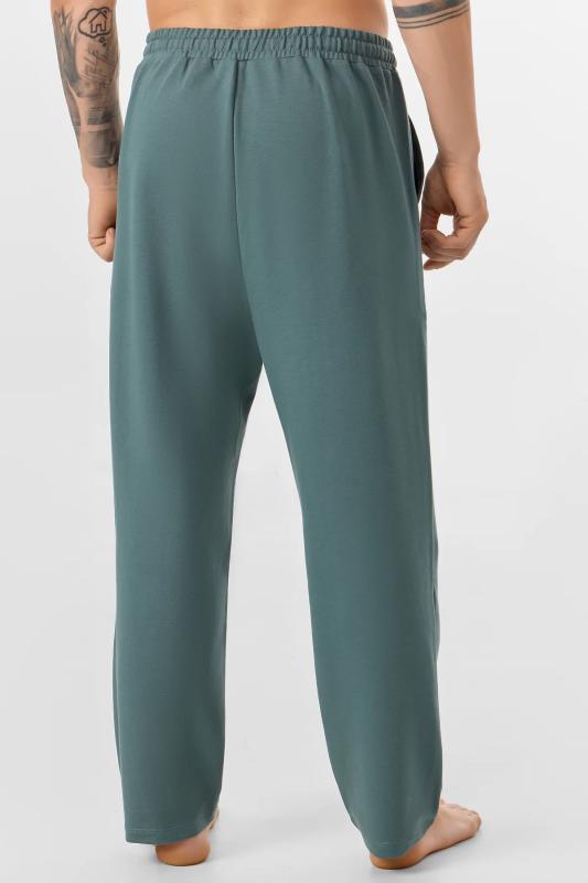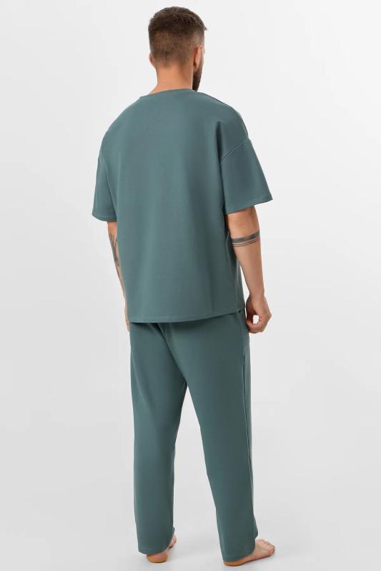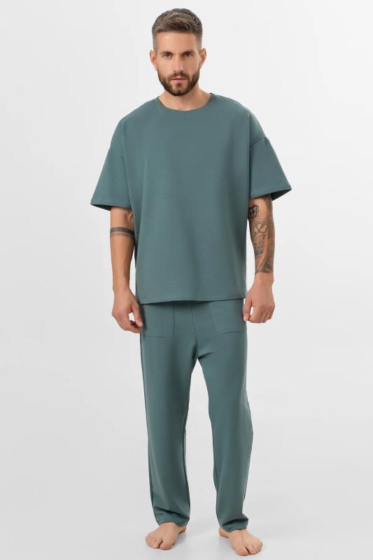 Комплект мужской изготовлен из трикотажного полотна кулирки. Футболка свободного силуэта. Перед и спинка цельнокроеные. Горловина округлой формы, обработана бейкой из основного полотна. Рукав втачной длинный, плечо спущено. Длина рукава чуть выше локтя. Нижние срезы обработаны швом вподгибку. Брюки прямого силуэта, с классической линией талии. Пояс цельнокроеный с эластичной тесьмой внурти. В боковых швах обработаны карманы. Нижние срезы брюк обработаны швом в подгибку.