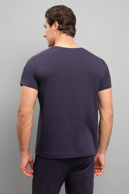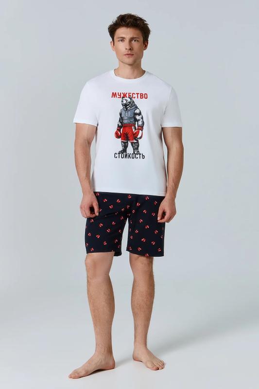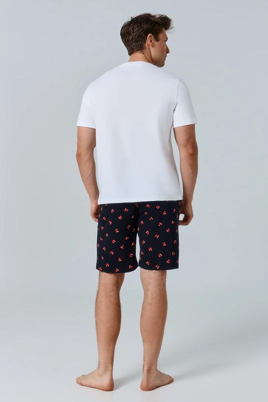 , а также темно-синих шорт на мягкой резинке с регулируемым шнурком. Футболка выполнена из 100% хлопка, что обеспечивает отличную воздухопроницаемость и комфорт, а шорты — из хлопка с добавлением полиэстера для большей износостойкости. Такая пижама идеально подойдет для домашнего отдыха и сна, подарит ощущение уюта и свободы движений. Стильный дизайн делает этот комплект отличным подарком для мужчины любого возраста.