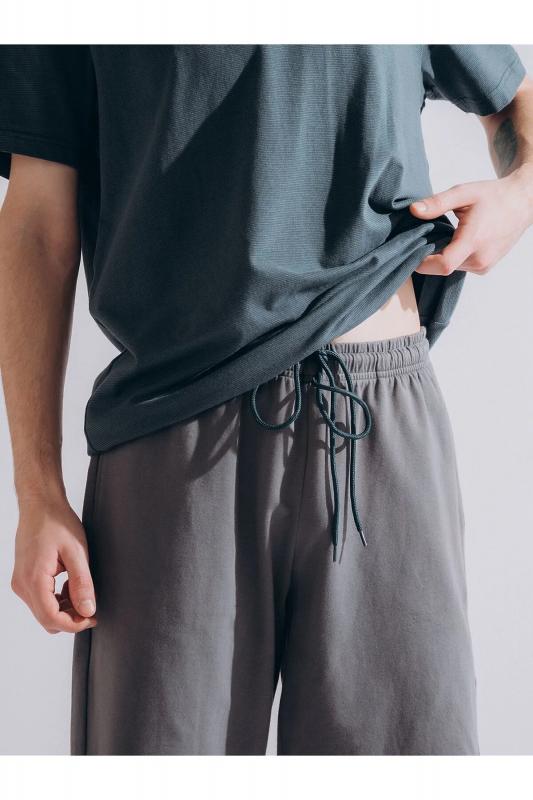 Комплект состоит из футболки и брюк. Комплект изготовлен из трикотажного полотна футер Футболка прямая свободная. Горловина округлой формы обработана обтачкой из основного полотна. Рукава втачные короткие, плечо спущено. Нижний срез футболки и рукавов обработан швом вподгибку. Брюки прямого силуэта, укороченные. Пояс отрезной с эластичной тесьмой внутри. С внешней стороны пояса пробиты петли и втянут шнур. На передних половинках накладные карманы. Нижние срезы брюк обработаны швом вподгибку.