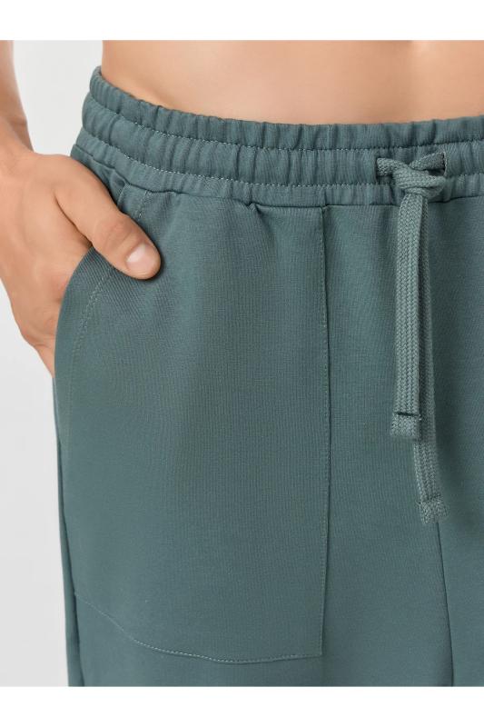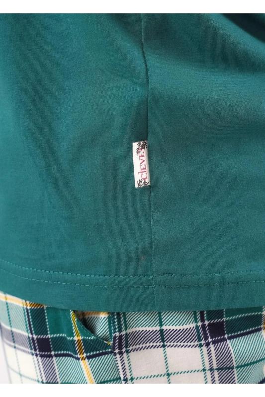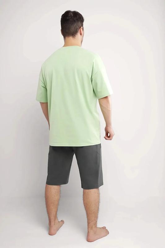 Мужская пижама 4041PBZ бренда Indefini изготовлена из хлопкового трикотажа. Она включает в себя футболку с шортами. Футболка прямого свободного кроя выполнена в зеленом цвете. Шорты серого цвета оснащены мягкой эластичной резинкой на талии с регулирующим шнурком.
