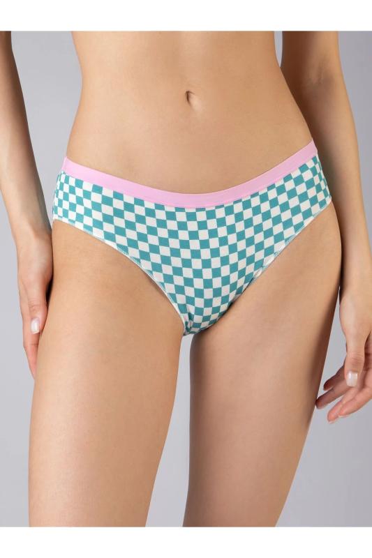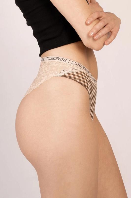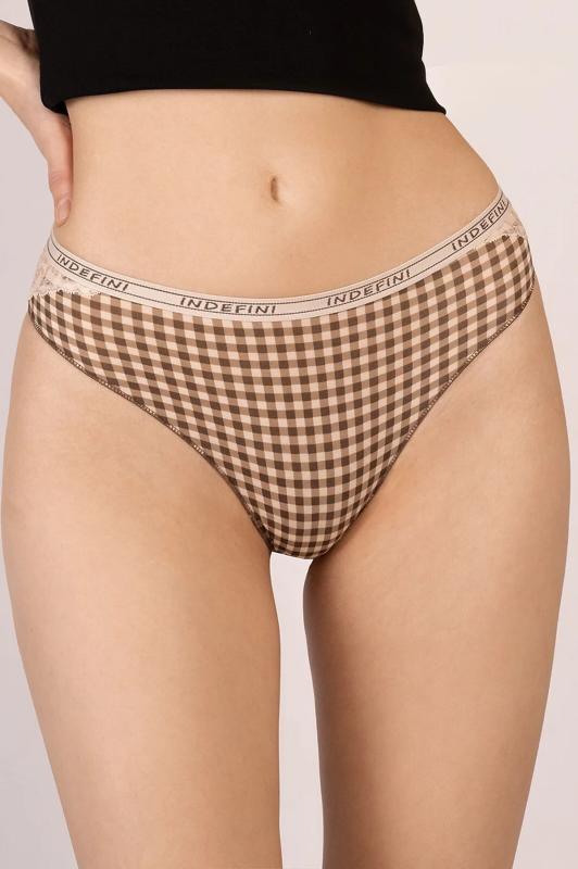 Трусы-слипы от Indefini выполнены из бамбука и хлопка, которые делают эти трусы гипоаллергенными и дышащими, что обеспечивает ощущение свежести и комфорта на протяжении всего дня. Бамбук в составе придаёт ткани мягкость и легкость, а хлопок добавляет изделию прочности и долговечности. Трусы средней посадки, на мягкой эластичной резинке, которая аккуратно фиксирует трусы на талии, не создавая давления и обеспечивая комфортную посадку. Оригинальный принт в бежево-коричневую клетку придаёт женским труса стильный и современный вид. Кружевные вставки по бокам и на задней части добавляют романтичности и женственности, делая эти трусы-слипы от Indefini не только удобными, но и визуально привлекательными.