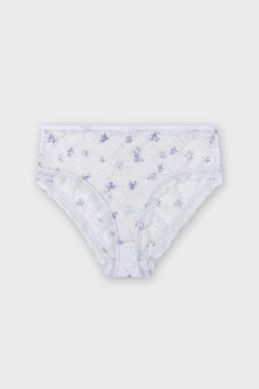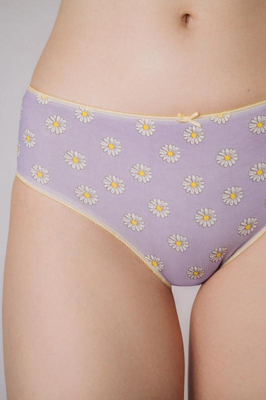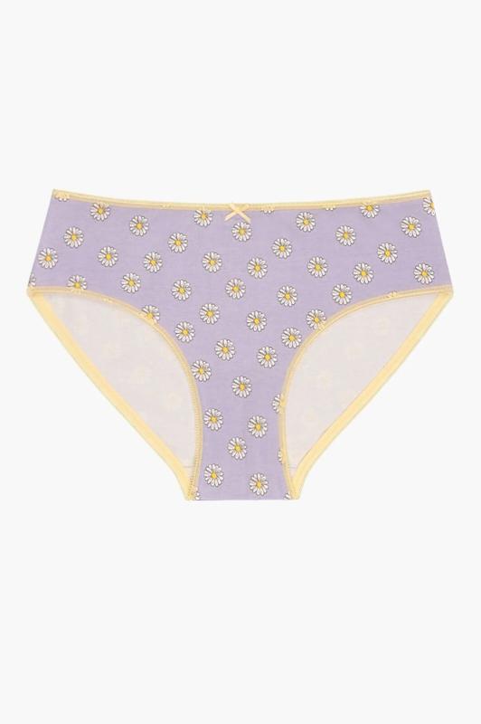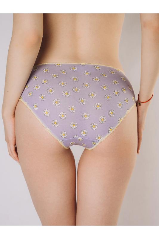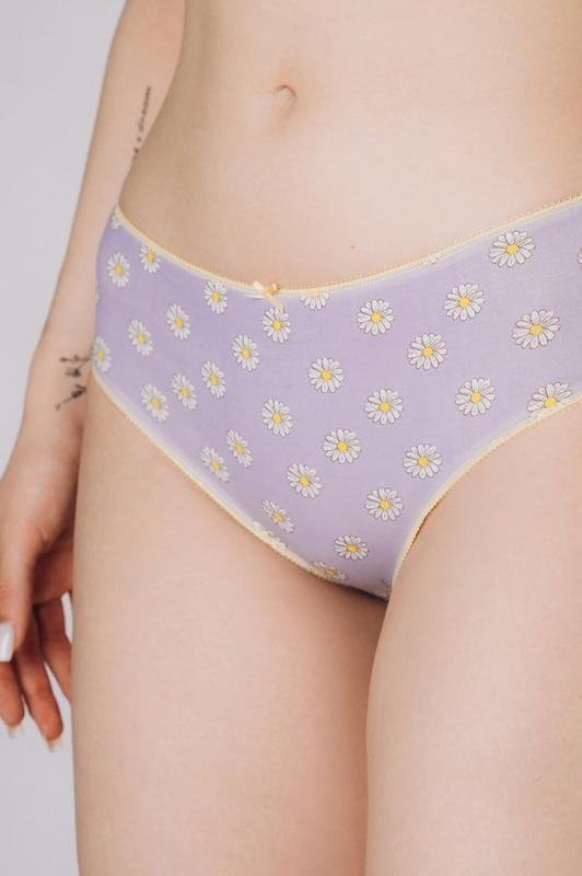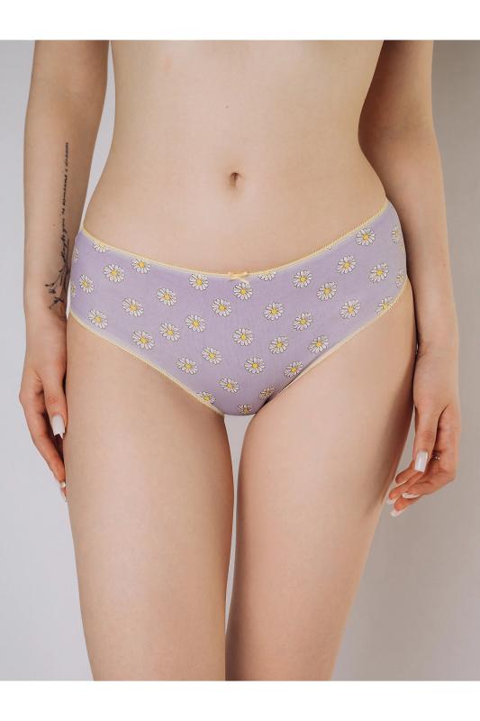 Трусы слипы женские 3085LUF бренда Indefini изготовлены из хлопка. Они выполнены в фиолетовом цвете с нанесенным цветочным принтом с изображением ромашек. Трусы имеют среднюю посадку и мягкую тонкую желтую резинку на талии. На передней части имеется желтый декоративный бантик. На внутренней стороне трусов расположена хлопковая ластовица.
