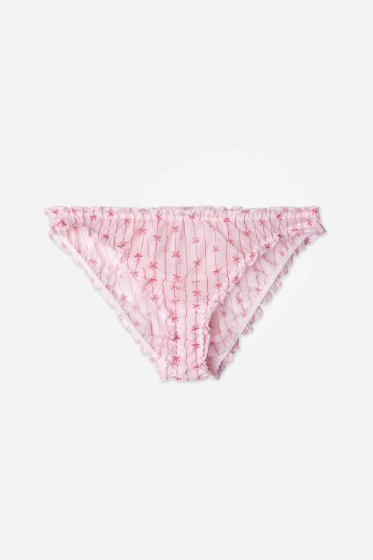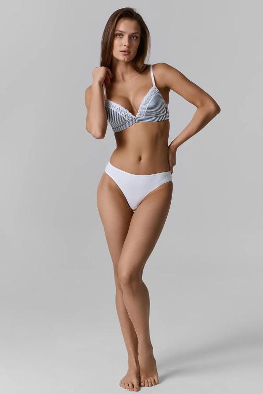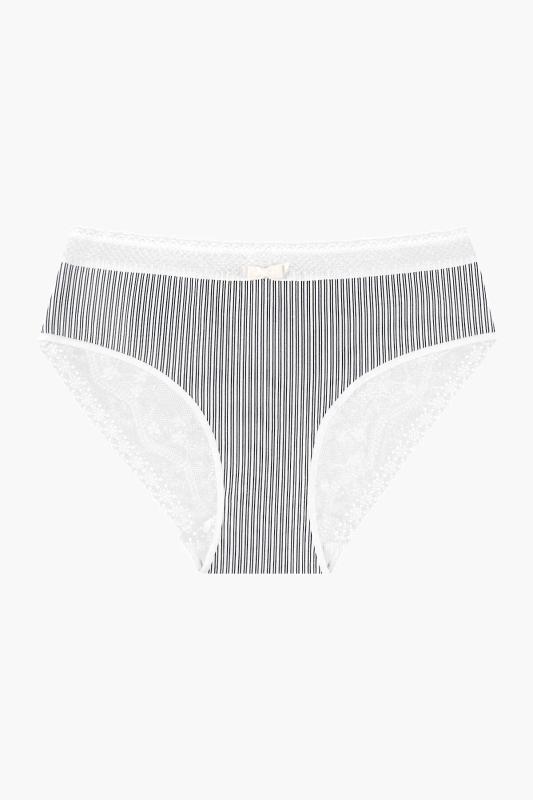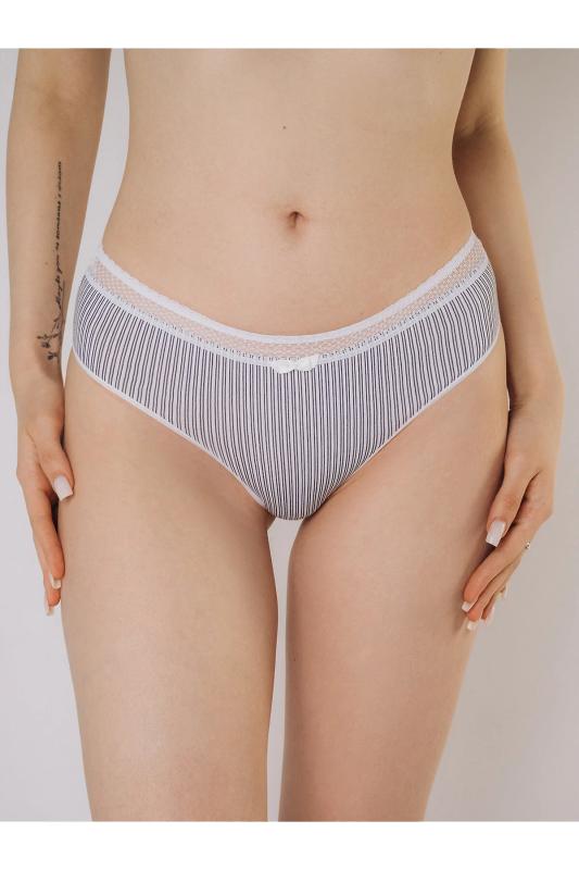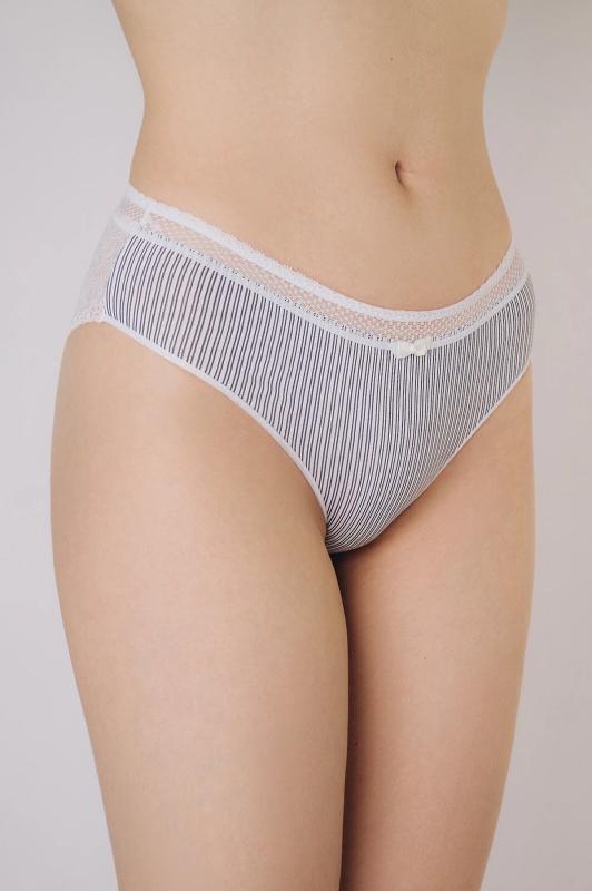 Трусы слипы женские 1426LUS бренда Indefini изготовлены из хлопка. Выполнены с принтом в черно-белую полоску. Трусы имеют среднюю посадку. Резинка обрамлена кружевом, задняя часть также выполнена в кружевной ткани. На передней части расположен белый декоративный бантик. Внутренняя сторона трусов дополнена хлопковой ластовицей.