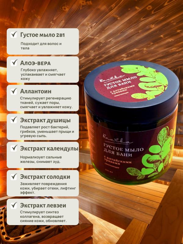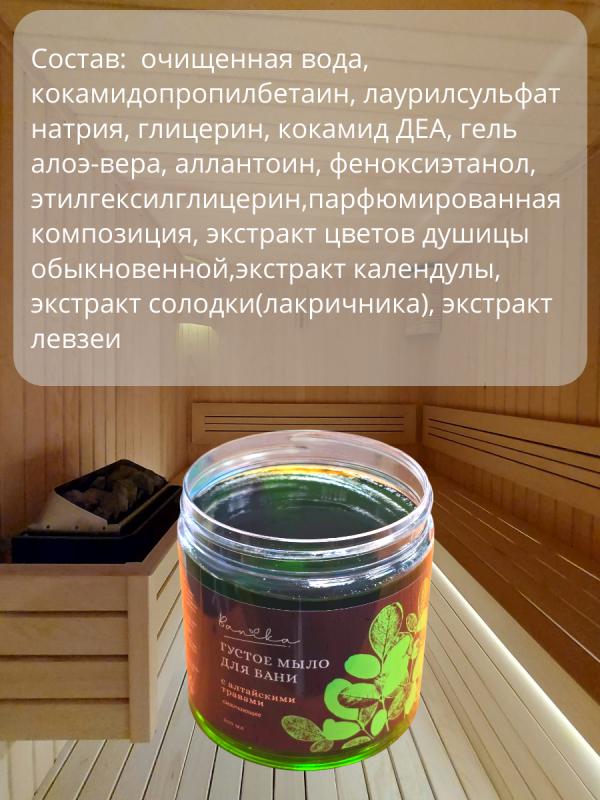 Густое мыло с алтайскими травами «Смягчающее», 500 мл.Забудьте о чувстве стянутости после мытья! Наше густое мыло с алтайскими травами предлагает деликатное очищение,а также длительное увлажнение вашей кожи. Прочувствуйте заботу природы с каждым использованием!Активные компоненты:Алоэ-вера: успокаивает и интенсивно увлажняет, сохраняя мягкость кожи.Комплекс экстрактов алтайских трав: поддерживает природное равновесие кожи, делая её более упругой.Аллантоин: восстанавливает и увлажняет, придавая коже гладкость.