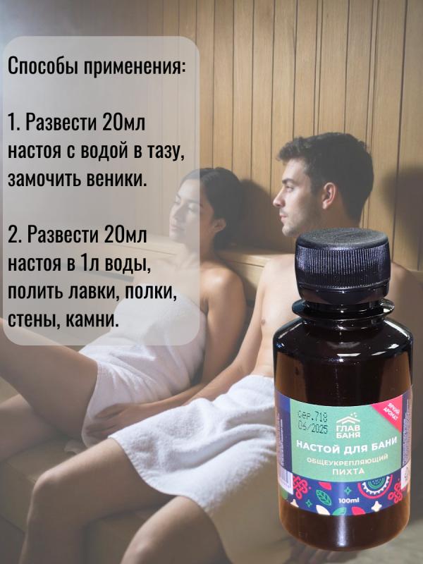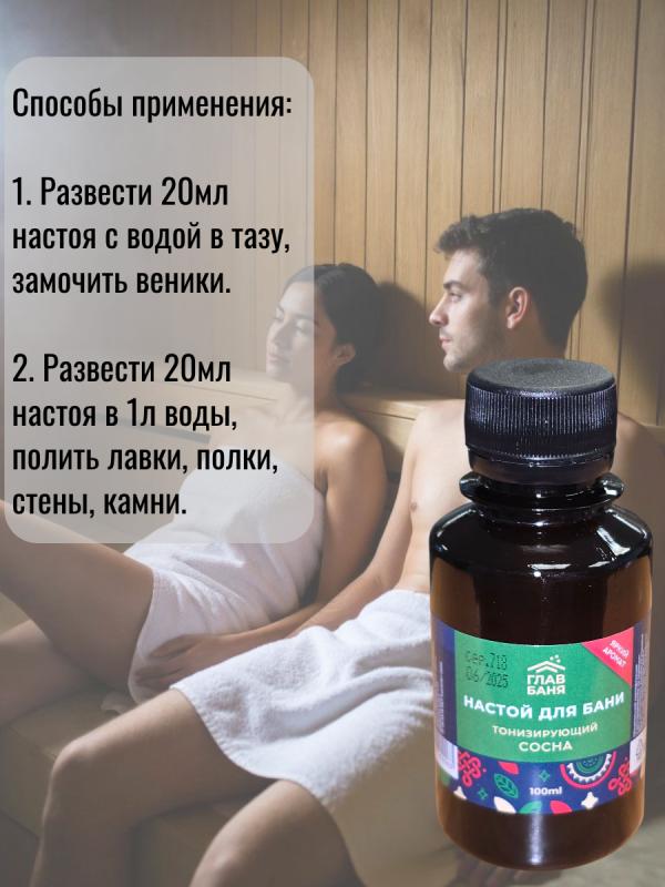 оказывает мощный оздоровительный и тонизирующий эффект.Разведите 5-10 мл настоя в литре воды, полейте получившимся раствором стены и полки парной, подайте на раскаленные камни или замочите в нем веник.Воздух парной наполнится приятным ароматом и полезными микроэлементами.Настои в бане используются еще с давних времен. Они позволяют сделать посещение бани не только приятным, но и полезным ритуалом.Воздух, обогащенный полезными веществами, благоприятно влияет не только на настроение и самочувствие, но и на кожу и волосы.
