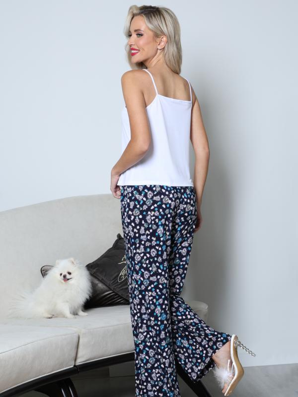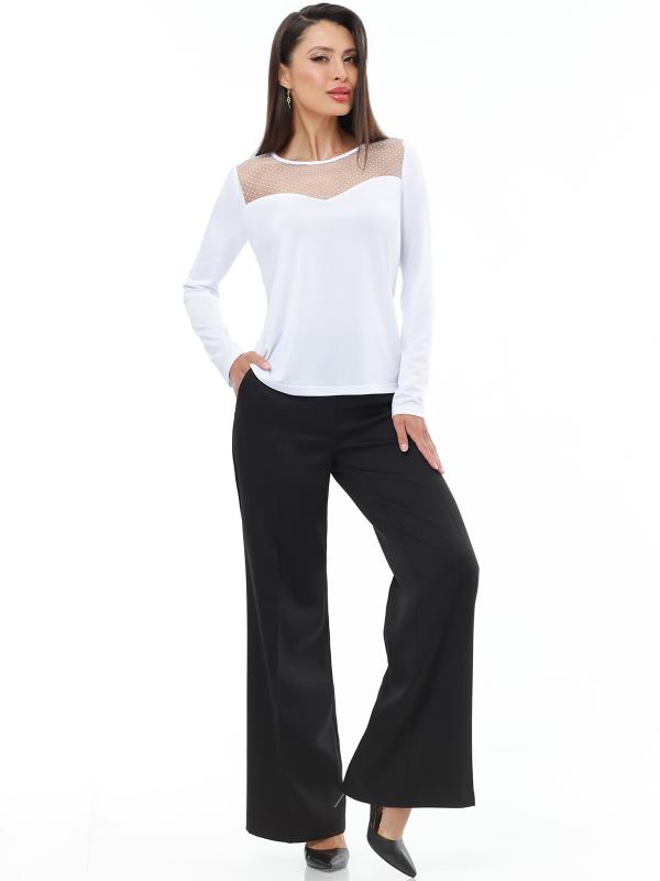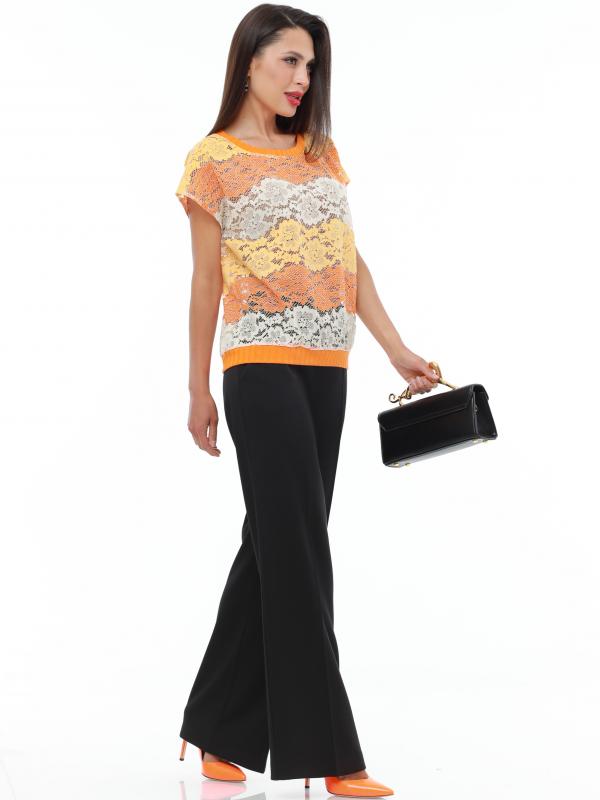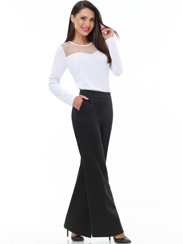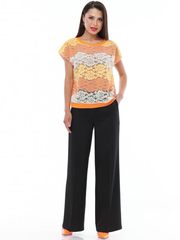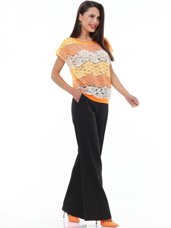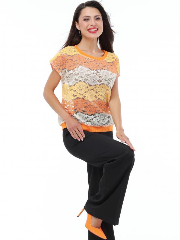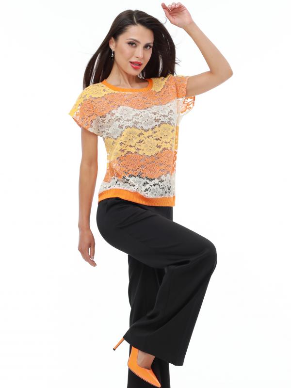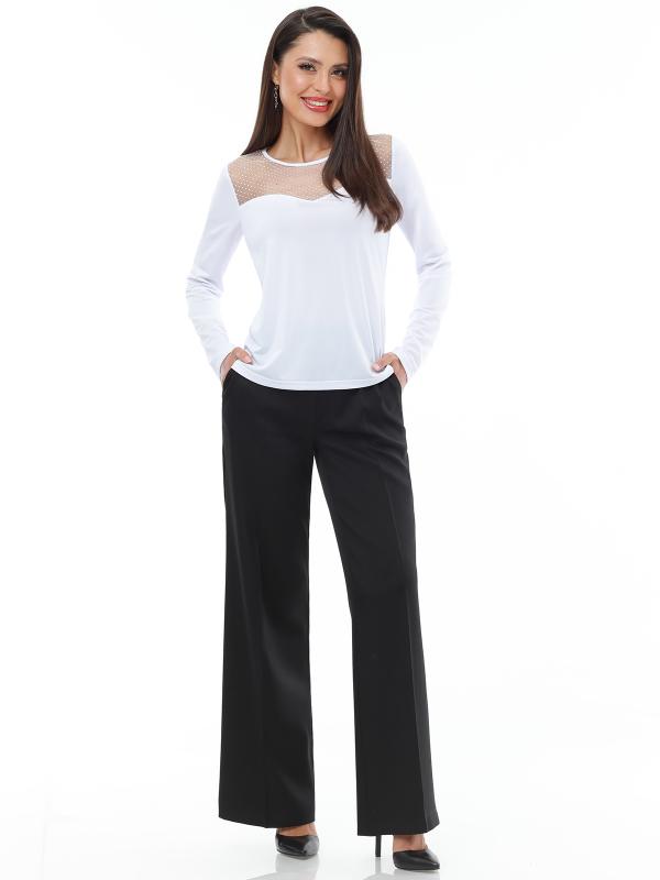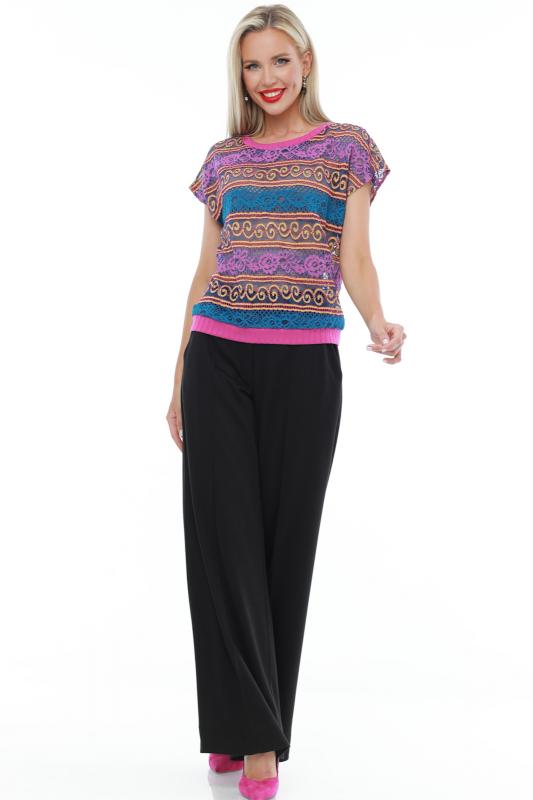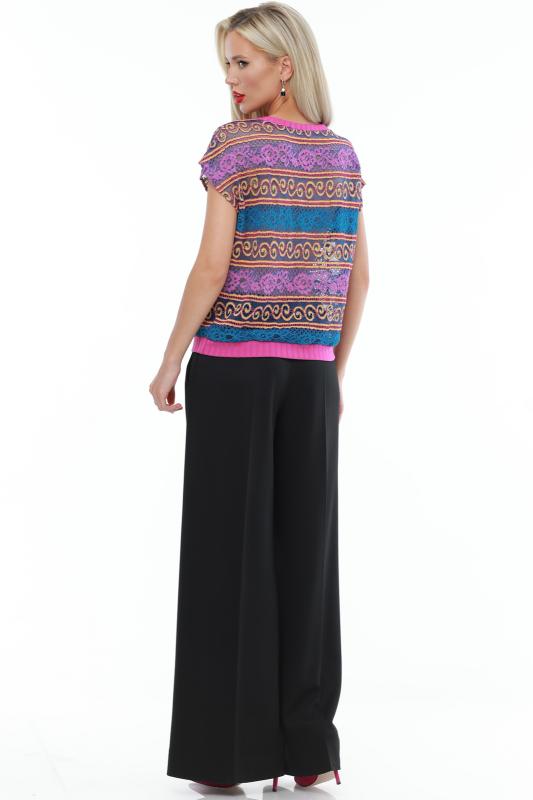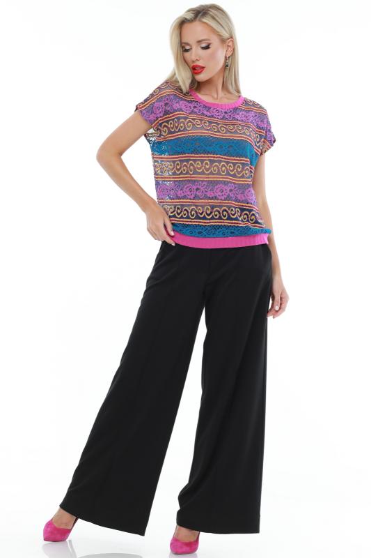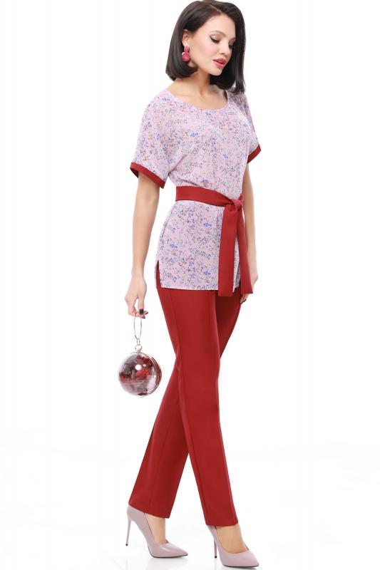 Легкий брючный костюм — яркая новинка, которая украсит как повседневный, так и офисный гардероб. Блузка полуприлегающего кроя с коротким рукавом не сковывает движений и прекрасно смотрится на женщинах любой комплекции. Благодаря вставкам из однотонной ткани и пестрому принту верх смотрится свежо и нарядно. Блузку всегда можно дополнить поясом из комплекта, чтобы создать женственный акцент на талии. Идеальной парой для нарядного верха становятся классические однотонные брюки со стрелками, которые задают деловой тон и смотрятся элегантно. Костюм выполнен из легкой, приятной к телу ткани креп, которая не просвечивает и слегка тянется. Чтобы комплект радовал вас красотой и качеством как можно дольше, рекомендуется стирать его в бережном режиме при температуре до 30 градусов без отжима и сушить в расправленном виде. Обмеры изделия Блузка: