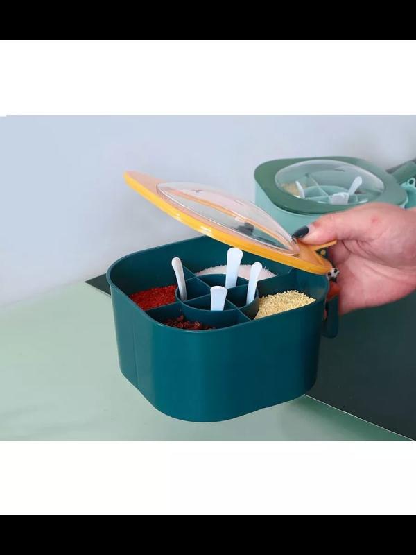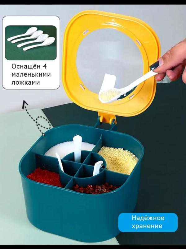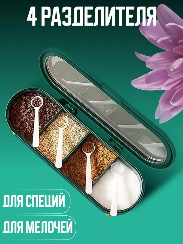 Контейнер для хранений специй-отличный кухонный прибор, помощник для хозяйки, а для дома красивый товар для интерьера. Стильное хранение сыпучих продуктов для вашей кухни. Преимущества органайзера - легко заменит множество банок, правильно организует пространство и подарит порядок и стиль на кухне, дома. Кухонный набор, органайзер для хранения состоит из 4-х отсеков с 4 ложками в комплекте. Ложки позволят правильно дозировать порции специй. Органайзер для специй, набор пластиковый изготовлен из высококачественного и безопасного пластика, не имеет запаха и не меняет вкус продуктов, есть прозрачная удобная крышка. Крышка герметично закрывает специи и создает удобное хранение и функционал. Благодаря вместительности каждой секции контейнера и удобному открыванию диспенсера, ускорит процесс готовки. Контейнер с разделителями очень удобен ещё и тем, что отсеки легко вынимаются и очищаются. Емкость можно использовать как для специй, для хранения сыпучих продуктов, так и в качестве солонки, сахарницы, пере
