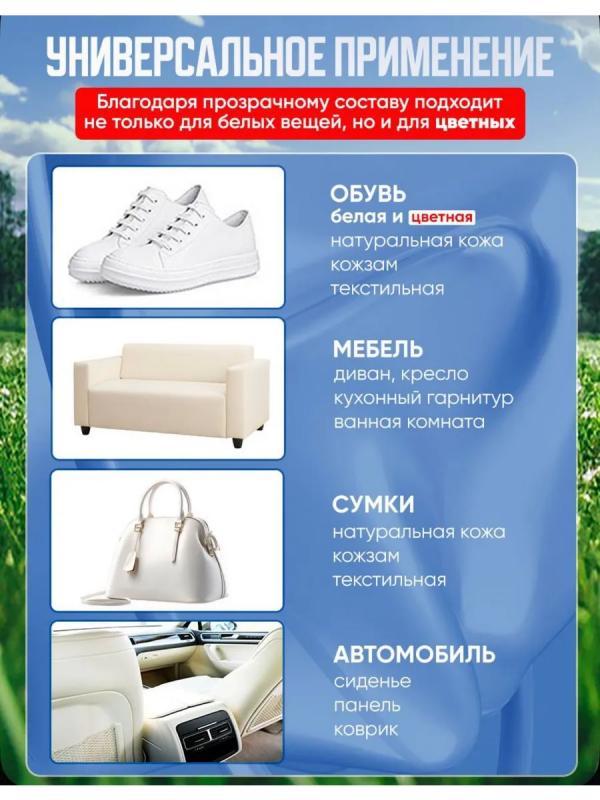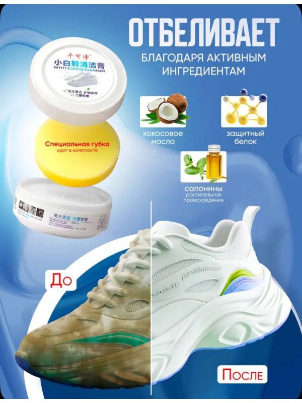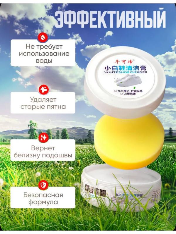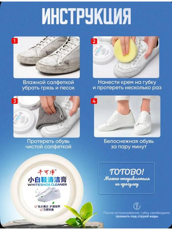 Очищающий бесцветный крем для обуви легко справляется с различными типами загрязнений без использования воды и моющих средств. Это средство идеально подходит для ухода за белыми кроссовками. Очиститель облегчает процесс очищения обуви от грязи без необходимости мыть её под краном. Брызги воды не летят на одежду, и не нужно ждать, когда обувь высохнет. Очищающая паста подходит для обуви из натуральной и искусственной кожи, эффективно чистит белые кроссовки и подошву. Благодаря натуральному составу, крем не портит обувь, не повреждает цвет, не оставляет следов и не наносит вред вашим рукам. Ваша белая обувь будет сиять. Перед нанесением крема, удалите песок и землю с обуви влажной салфеткой. Затем нанесите небольшое количество крема на губку и протрите поверхность. Крем очиститель для кожаной обуви справляется с загрязнениями эффективнее, чем пена или спрей для отбеливания обуви, создавая защитную влагоотталкивающую пленку. Наш крем для белой обуви популярен среди жителей Москвы, Санкт-Петербурга и д