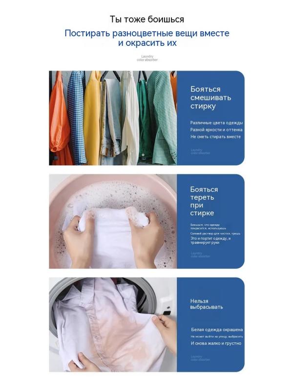 Салфетки ловушки цвета эффективно защищают вещи от окрашивания при стирке в стиральной машине. Впитывая лишние красители позволяют добиться идеального состояния цветных и белых вещей. Салфетки без ворсовые, одноразовые, пропитаны специальным составом, который притягивает нестойкие красители из цветных тканей и защищает от случайного окрашивания более светлое белье. В комплекте 50 штук салфеток, которые позволяют одновременно стирать белые и цветные вещи, не опасаясь линьки и потери внешнего вида. В процессе стирки ловушка притягивает на себя красители, способствуя более эффективной стирке и чистоте вещей. Салфетки для стирки от окрашивания. Салфетки для одежды при стирке белья действуют как уловитель и блокатор цвета. Эффективная защита белья от окрашивания и восстановление цвета. Магнитные салфетки подходят для стирки не только повседневного, но и постельного белья, пуховика и верхней одежды. Подходят для стирки против окрашивания, восстанавливают цвет. Благодаря магнитам цвета можно не сортироват