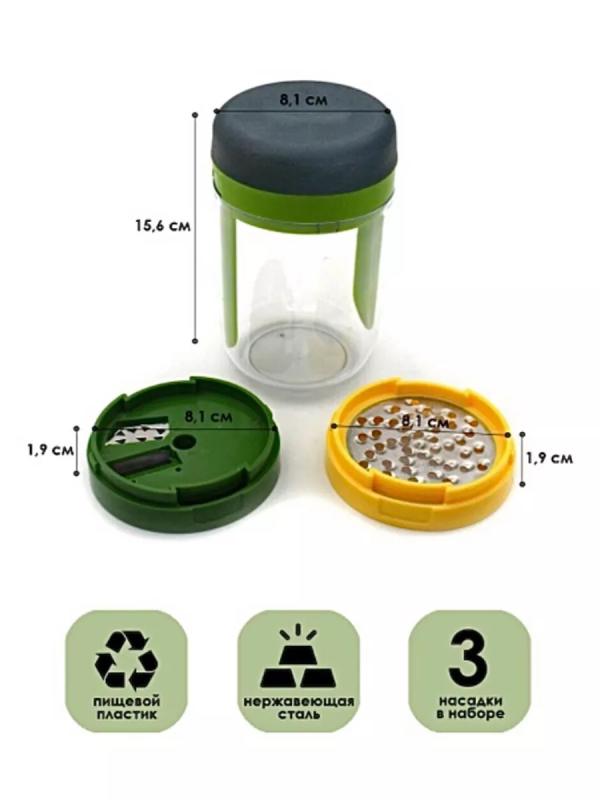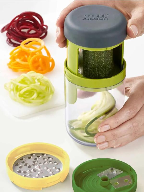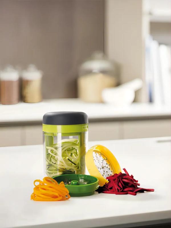 Спиральная терка открывает новые возможности для тех, кто любит готовить. В комплект входит крупное и среднее лезвие, насадка для сыра и небольшой контейнер для сбора натертых овощей или фруктов. Легкая в использовании конструкция делает длинные ровные полосы при закручивании. Полученная овощная «лапша» подходит для украшения праздничных блюд или для приготовления различных салатов. Приятная на ощупь рукоятка не выскальзывает во время эксплуатации. Все элементы соединяются в одном контейнере и занимают минимум места в ящике стола. Можно мыть в верхней части посудомоечной машины. Идеальна для кабачков, цуккини, свеклы, сыра, огурцов, кусочков тыквы.