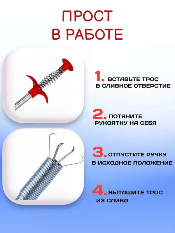 Cантехнический трос для прочистки канализации со щупом. Пружинный трос со спиральным наконечником применяется практичными хозяевами как в квартирах, так и в частных домах. Он идеален для устранения засоров в ванной комнате и кухне. Справится с любыми загрязнениями лучше вантуза. Механический трос, улавливатель мусора и волос, приспособление для прочистки труб: работает как вантуз, но без лишних брызг моментально избавит от засоров в трубах. Прочистка не требует разборки сифона, если диаметр отверстия решетки больше 1 см.Принцип действия очень прост: просовываете трос в трубу до места засоров, при помощи рычажка раскрываете лапки хапуги и хватаете мусор. Далее вам необходимо вытащить трос вместе с мусором. . Если трос не проходит в отверстие слива раковины, необходимо открутить слив для удобного доступа. Трос сантехнический с захватом защищен дополнительным защитным слоем из прочного ПВХ материала, что позволит с легкостью очищать его после использования. Просто вставьте конец троса в отверстие труб