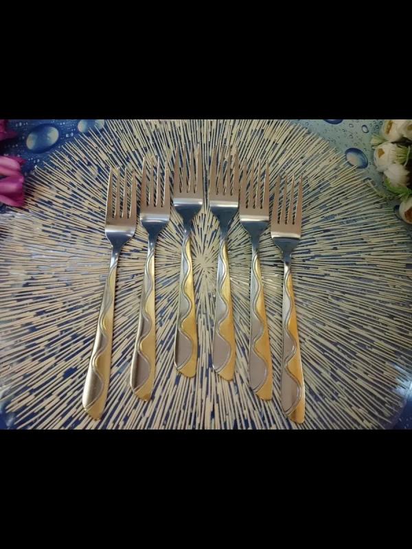 Набор из 6-ти столовых приборов отличаются антикоррозийными свойствами и высокой устойчивостью к кислотам и щелочи. Набор вилок выполнен из высококачественной нержавеющей стали, которая проходит тщательный контроль. Такая сталь не изменяет вкус и цвет пищи и не выделяет вредные вещества. Ручки столовых приборов украшены красивым стильным узором под золото. Стильный набор столовых приборов станет настоящим украшением любого праздничного или обеденного стола. Внимание! Перед первым применением тщательно промойте приборы для сервировки мягкой губкой с моющим средством.