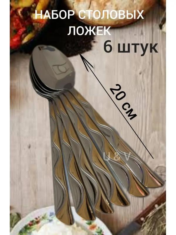 Набор из 6-ти столовых приборов отличаются антикоррозийными свойствами и высокой устойчивостью к кислотам и щелочи. Набор столовых ложек выполнен из высококачественной нержавеющей стали, которая проходит тщательный контроль. Такая сталь не изменяет вкус и цвет пищи и не выделяет вредные вещества. Ручки столовых приборов украшены красивым стильным узором под золото. Стильный набор столовых приборов станет настоящим украшением любого праздничного или обеденного стола. Внимание! Перед первым применением тщательно промойте приборы для сервировки мягкой губкой с моющим средством.