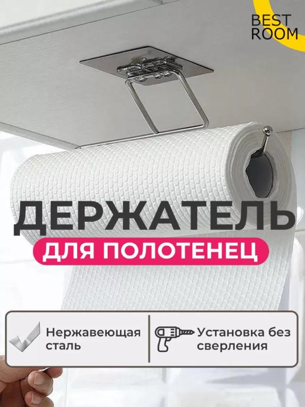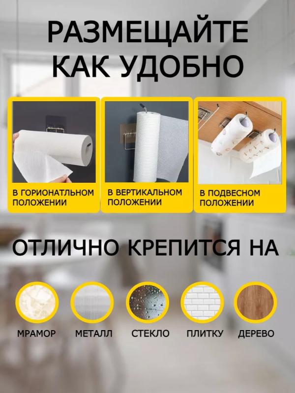 С помощью подвесного держателя вы можете разместить бумажные полотенца в удобное место под полочками или на дверцу шкафа. С ним Вы без проблем всегда можете быстро воспользоваться полотенцами: протереть поверхности стола, обсушить руки, фрукты, овощи или мясо. Вы сэкономите много времени, ведь больше не придется подолгу искать полотенца, фольгу, пленку или пергамент. Универсальный кухонный держатель вешалка выполнен из хромированной стали и предназначен для удерживания как кухонных бумажных или тканевых полотенец, так и прочих принадлежностей обихода. Крючок оснащен креплением на клейкой прозрачной ленте, чем завоевал любовь домохозяек, поскольку его монтаж и с эстетической стороны и в плане сохранения целостности не испортит поверхность на которую будет крепиться, чтобы установить его не потребуется даже помощь сильного пола, представительницы прекрасного пола справятся и сами, нужно только дополнительно очистить участок поверхности к которому будет прикреплен изящный девайс, обезжирить его, снять