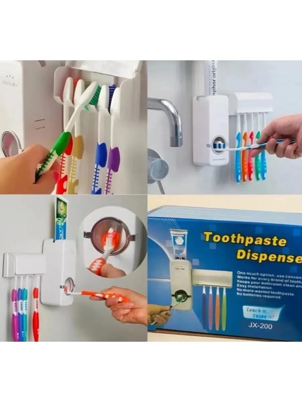 Данный дозатор для зубной пасты с держателем для щеток (в количестве до 5 штук )является настенным. Подходит для большой семьи. Набор будет идеальным дополнением для вашей ванной комнаты и сделает вашу жизнь более комфортной. Принцип работы аналогичен тому, что используется в диспенсерах для жидкого мыла. Зубные щетки находятся под крышкой, что позволяет им быстро сохнуть и быть защищенными от загрязнений. Данный распределитель делает процесс утренней гигиены увлекательной и абсолютно безопасной для маленьких детей. Он ограничивает количество пасты и выдает только столько, сколько нужно для чистки зубов. Он компактен и легко устанавливается, так как требуется всего лишь клеевое крепление, что исключает необходимость сверления или повреждения стен. Свободно разбирается и моется, когда это необходимо. Белый дизайн прост и элегантен, поэтому отлично впишется в любой интерьер.