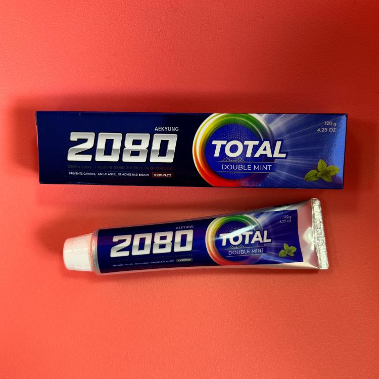 Мультивитаминная фторсодержащая зубная паста 2080 «Фруктовая мята» освежает дыхание, защищает от кариеса и отбеливает.
