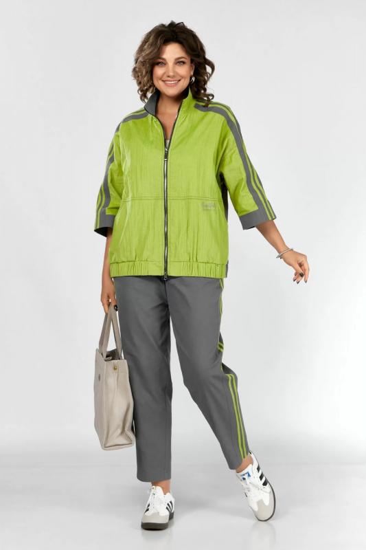 Бомбический костюм в стиле спорт-шик!!! Плотная ткань по тактильности хлопок, Брюки в размере 52 сели идеально на объём бедер 110 см, талия на резинке. Карманы достаточно глубокие, удобные. Длина брюк на рост 166 отлично, даже с небольшим запасом. Можно подвернуть, сделать 7/8, на лето. Куртка тоже села неплохо, немного кажется широковата, но вида не портит абсолютно, надо учитывать что такой крой и задумка. Рукав укороченный. Салатовые вставки выполнены из ткани типа микровельвет, темная часть костюма хлопок. Нигде не жмёт, не тянет, и более того - очень удачный крой и брюк, и куртки, визуально вытягивают фигуру и делают стройнее. впереди не борит в паховой зоне, смело можно одевать майки покороче. В общем очень довольна приобретением, давно покупка не приносила такой искренней радости и удовольствия!