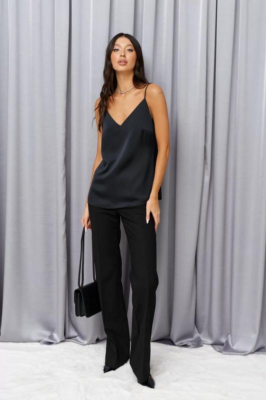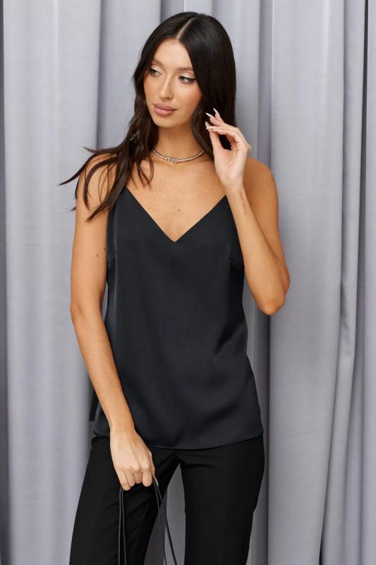 Топ прямого кроя выполнен из сатина темно-синего цвета. Характеристики: прямой крой, вытачки по груди, тонкие бретели с регулировкой, в зоне декольте V-образный вырез. Длина изделия по боковому шву 40см.