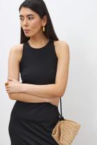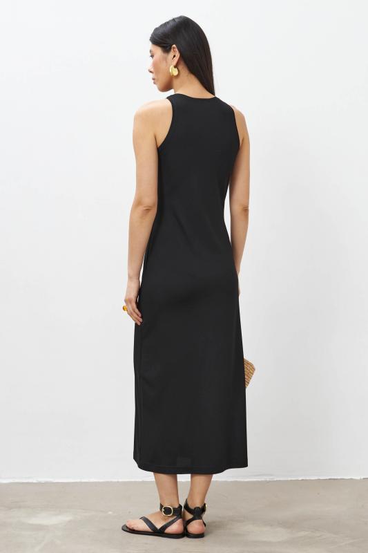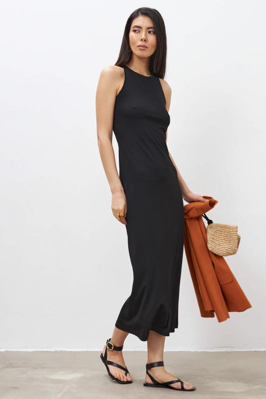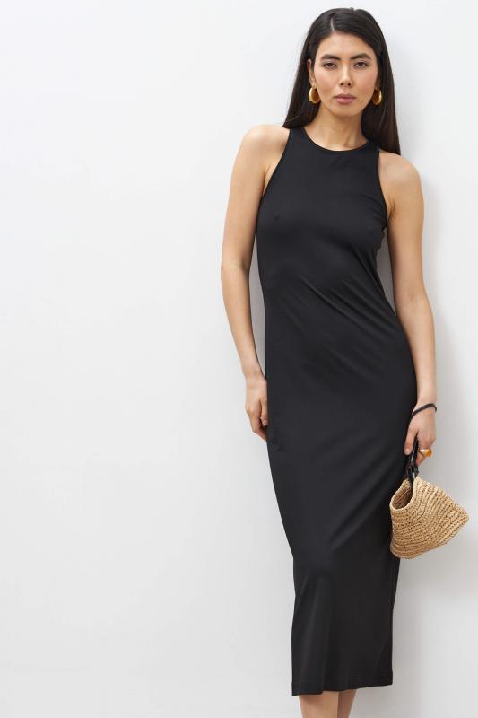 Стильное платье с воротником халтер из тонкого трикотажного полотна джерси. Прилегающее платье с с открытыми плечами. По горловине и плечам бейка из основной ткани.