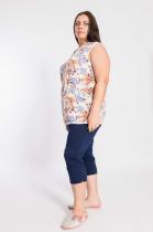 Майка женская выполнена из лёгкой хлопковой ткани с набивным рисунком. Крой прямой, вырез горловины круглый. Спереди расположены два накладных кармана. Горловина, проймы, карманы и низ изделия обработаны бейкой контрастного цвета.