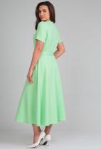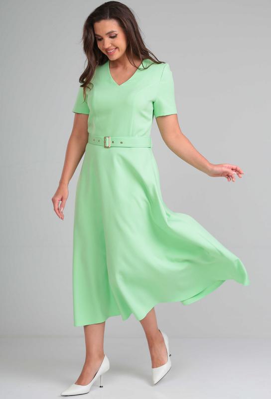 Платье полуприлегающего силуэта. Вырез горловины V - образный. Рукав короткий, по линии талии платье отрезное. Юбка полусолнце-клёш. По талии съёмный пояс, который регулируется с помощью пряжки и люверсов. По спинке втачана потайная тесьма-молния. Ткань приятная к телу. . Длина платья около 123см ± 2см. Длина рукава 23см ± 1см..