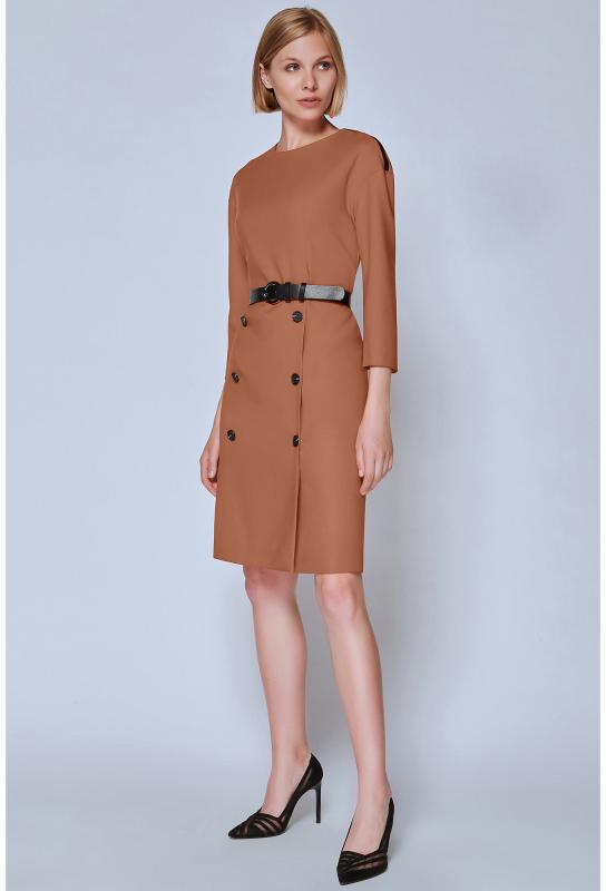 Стильное платье полуприлегающего силуэта с округлой формой горловины, спущенной линией плеча с отделочной тесьмой и притачными одношовными рукавами. Нижняя часть переда платья с имитацией двубортной застежки с пуговицами. В среднем шве спинки обработана застёжка на потайную молнию.. Длина платья в 48р - 99см, рукав от горловины - 61см.. .