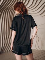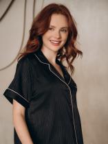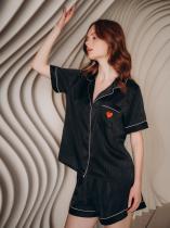 Домашняя пижама от торговой марки Индефини. В комплект входит рубашка и шорты. Рубашка из полиэстера, черного цвета, с принтом-нашивкой, с короткими рукавами, с обрамлением, с воротником-отворотом, с кармашком на груди, на пуговичках, прямая, свободного кроя. Шорты из полиэстера, черного цвета, с принтом, с обрамлением, свободного кроя, на мягкой резинке.
