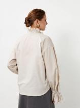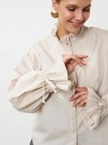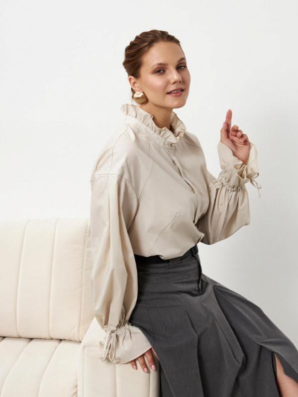 Легкая, воздушная, романтичная блузка-рубашка, с объёмными нарядными рукавами. Функциональные резинки на запястьях обеспечивают удобство и регулировку длины рукава. Модные манжеты придадут особый шик вашему образу. Воротник-стойка расширен, что обеспечивает удобство и комфорт, а также идеальную посадку на все фигуры, а изящная рюша сделает образ законченным. Нежная женская блуза отлично подойдет для офисных будней и вечерних выходов в свет. Прекрасно смотрится с узкими брюками-дудочкам или широкими палаццо, офисными брюками или джинсами для создания образа в стиле кэжуал.