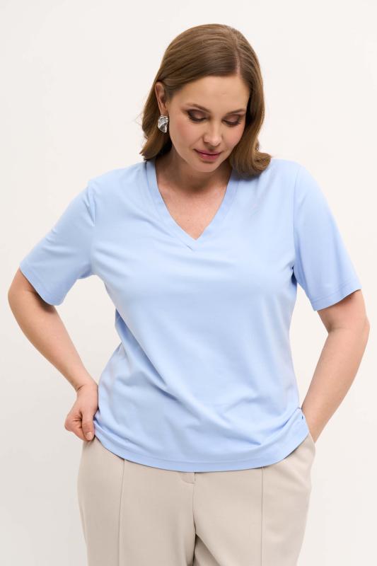Джемпер из вискозного трикотажа. Модель свободного силуэта. По переду V-вырез. Рукав втачной, короткий.