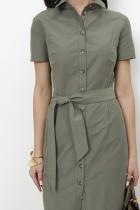 Платье приталенного силуэта из хлопковой плательной ткани. Изделие отрезное по линии талии с защипами. В боковых швах карманы. Втачной короткий рукав. Притачная планка с застёжкой на пуговицы. Вырез горловины обработан отложным воротником на стойке. В комплекте пояс из основной ткани.