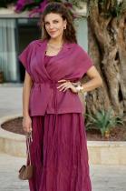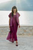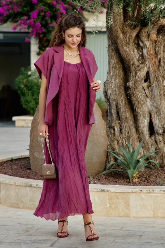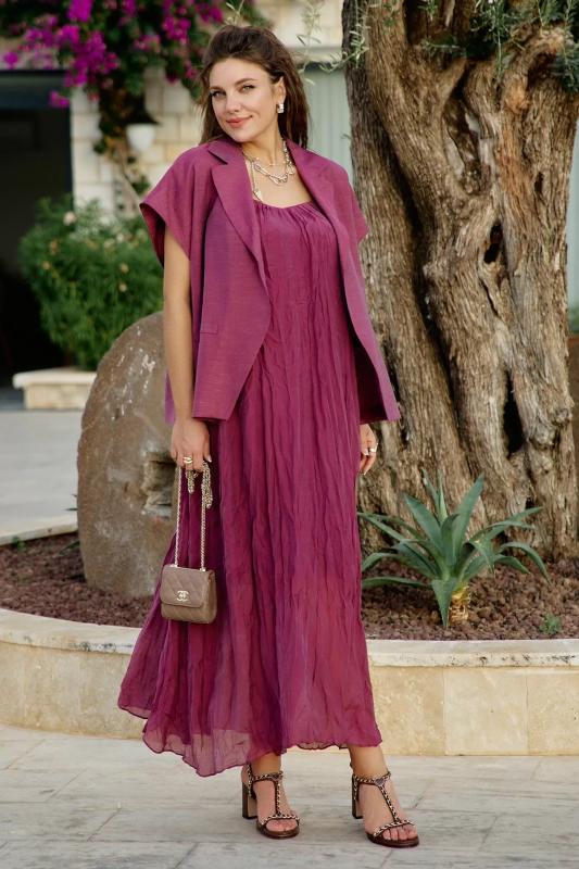 Комплект женский, состоящий из жилета и платья длины «миди». Контраст между гладкостью жилета и фактурностью платья создает визуальную глубину, делает образ интересным для рассмотрения с разных расстояний. Жилет свободного силуэта, на «запах» с фигурной линией борта. Запах — это не просто застежка, он создает динамичную асимметрию — одна сторона накладывается на другую, создавая живую, нестатичную форму. А также игру объемов — в зависимости от того, как завязан жилет, меняется его силуэт. Возможность трансформации — его можно носить плотно запахнутым или свободно, с открытыми полами. Воротник отложной, пиджачного типа. Линия плеча в жилете спущена. По переду жилета декоративные листочки. Спинка со средним швом. В комплекте идёт декоративный пояс из основной ткани. Платье с характерным "